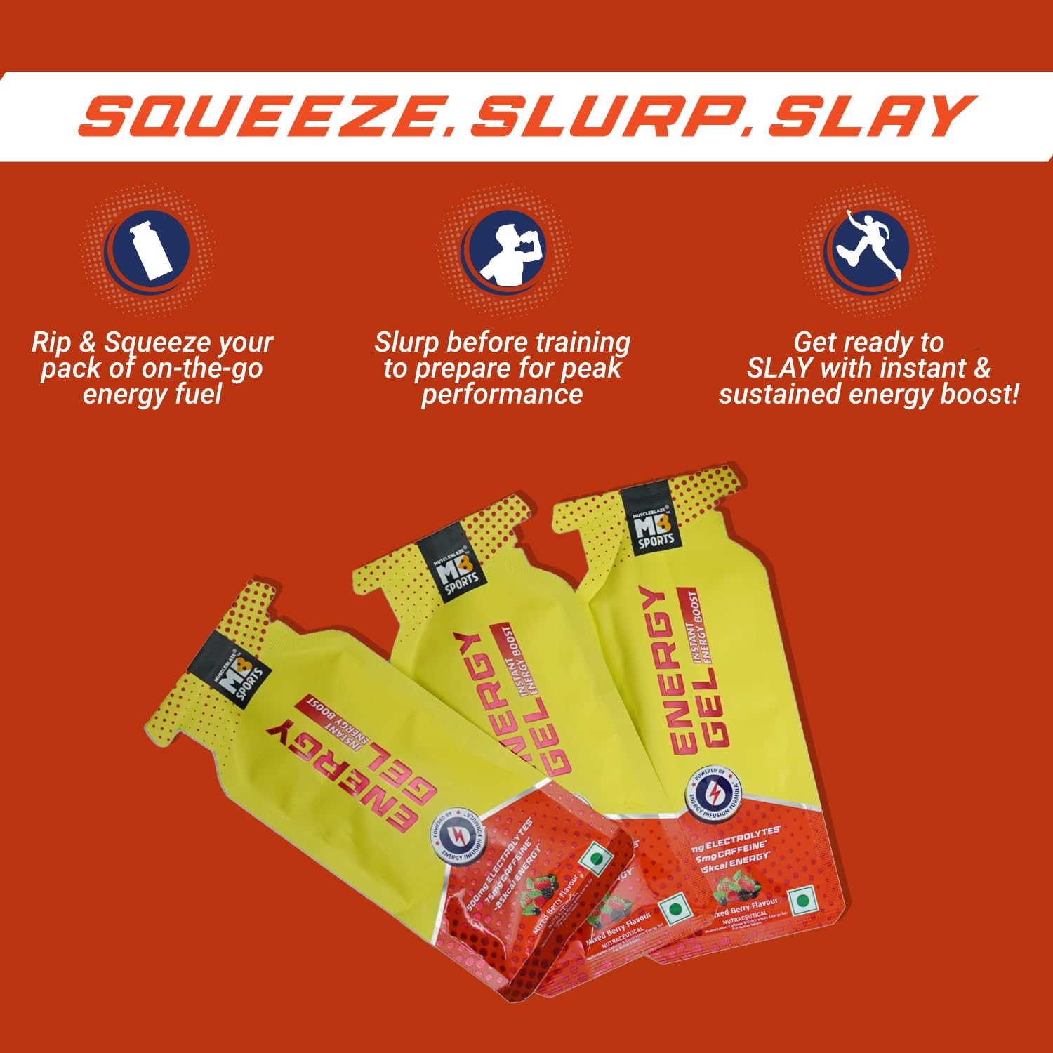 • Electrolyte replenishment: Sweat happens but dehydration shouldn't. MB Sports Energy Gel's balanced 500mg electrolyte complex helps you replenish what you lose keeping you hydrated and performing at your peak.