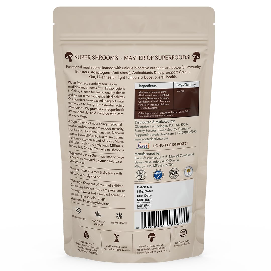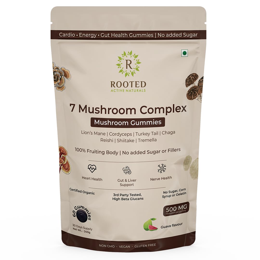 Delicous Guava flavoured No Added Sugar Gummies with 500 mg of 7 Mushrooms extract extract per gummy.