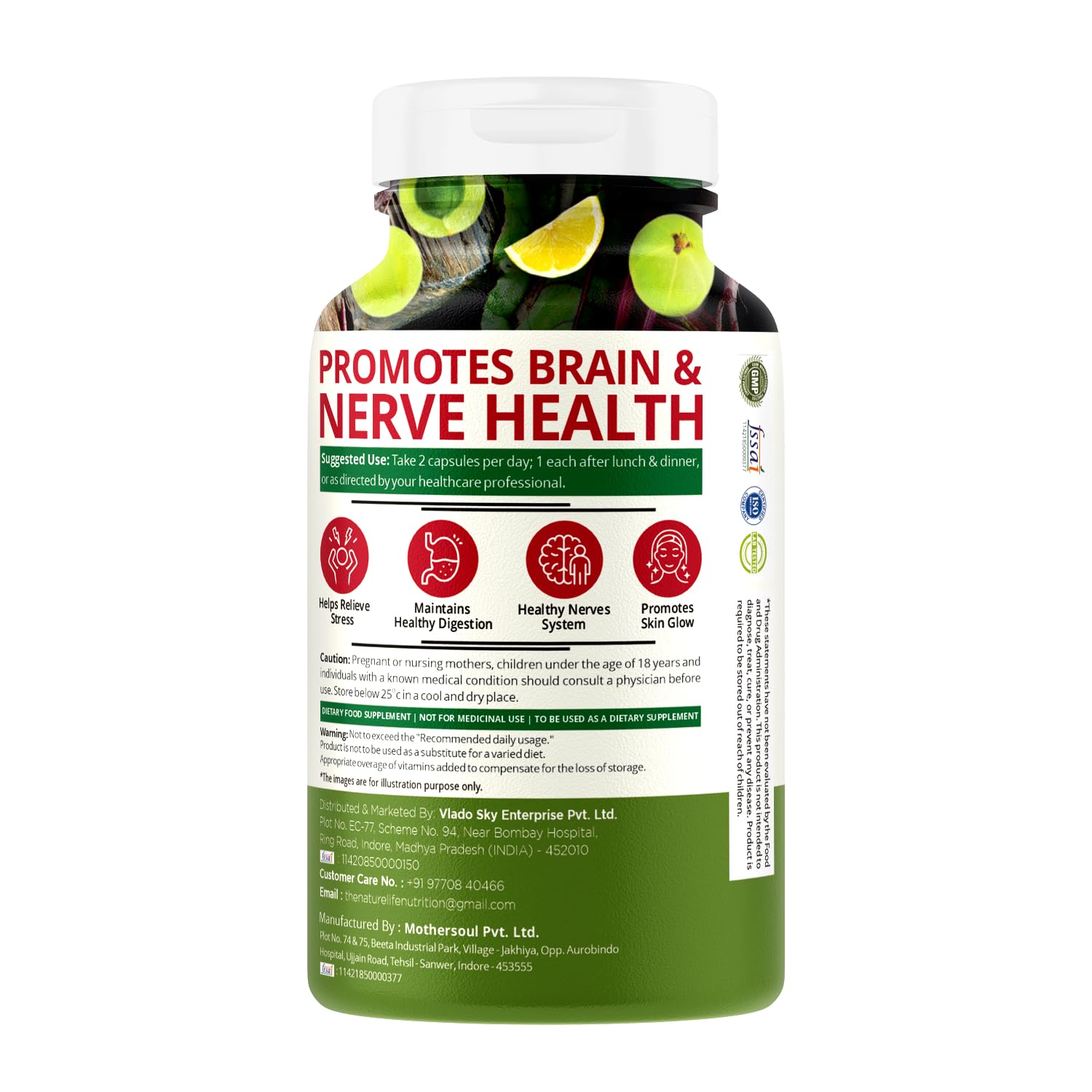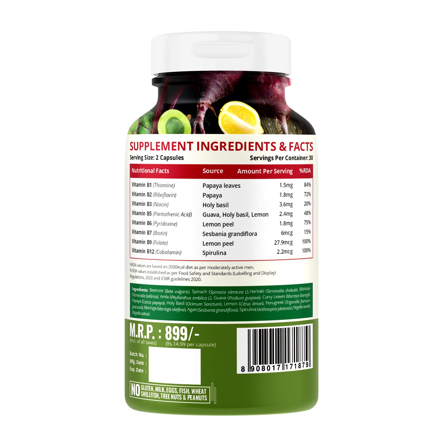 Plant-based Vitamin B12 to support various roles in your body. A blend of plant-based extracts like Stevia Leaves Alfalfa Leaves Moringa Wheat Grass Green Amla & Beetroot these capsules fulfill the daily dose of Vitamin B12 in your body. Your body needs Vitamin B12 for normal functioning of nerve cells red blood cell formulation boosting energy DNA synthesis and improving memory. Experience healthy days by incorporating these capsules into your daily life! Green Superfood with 5X power!