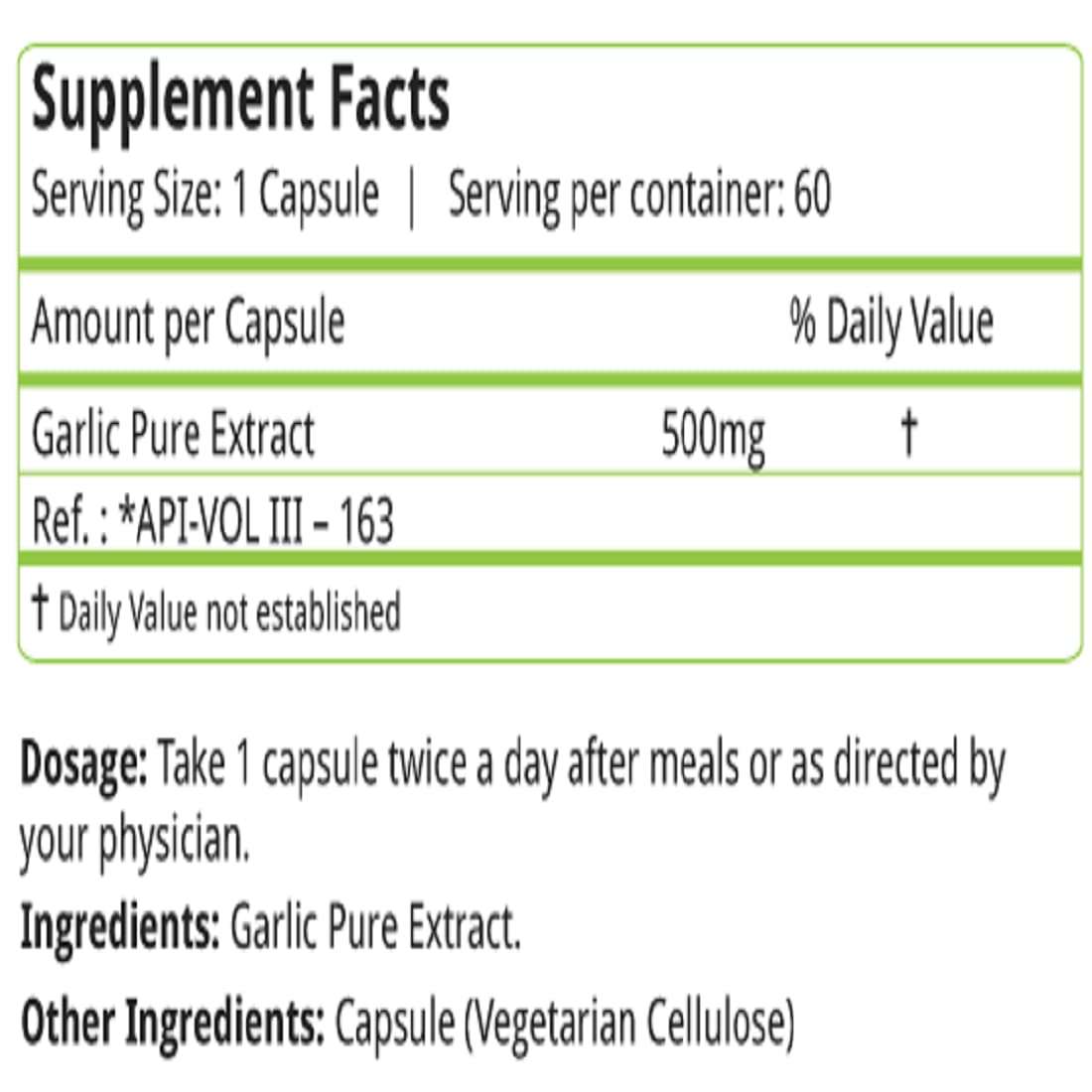 Natures Velvet Garlic has 500mg of Pure Extract. It has been formulated as Vegetarian Capsules.Its an ayurvedic Product. It has been manufactured at a GMP certified facility.