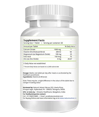 The formulation features a high potency combination of bone-healthy calcium magnesium zinc and vitamin D. Calcium is the primary mineral responsible for bone strength magnesium and vitamin D are essential for proper bone mineralization and zinc is involved in the synthesis of collagen in bone tissue. Calcium (Calcium citrate Malate) 1000 mg Vitamin D3 200 IU Magnesium (as Magnesium Oxide) 100 mg Zinc (as Zinc sulphate) 4 mg Folic Acid 150 mcg