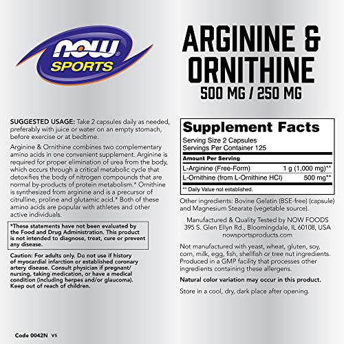 Now Foods Arginine & Ornithine 500/250mg - 250 Caps 2 Pack