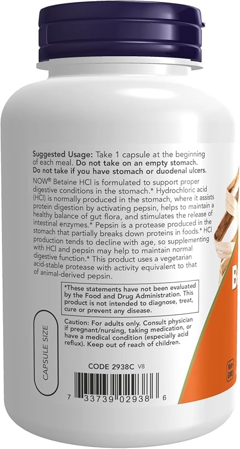 Now foods betaine HCL is formulated to support proper digestive conditions in the stomach. Hydrochloric acid (HCL) is normally produced in the stomach where it assists protein digestion by activating pepsin helps to maintain a healthy balance of gut flora and stimulates the release of intestinal enzymes. Pepsin is a protease produced in the stomach that partially breaks down proteins in foods.