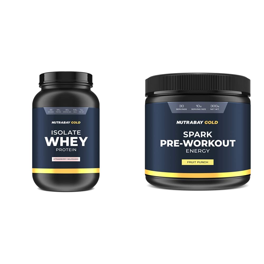 Nutrabay Gold Whey Protein Isolate - Strawberry Milkshake 1kgNutrabay Gold Whey Protein Isolate is designed to give you a rich protein source for building muscle and faster recovery. It is complemented with an enzyme blend for improved digestion higher and faster protein absorption. We use one of the highest quality ingredients available in the market to ensure that you get the best results. Our unique highly researched and best in class flavours get you a delicious whey protein shake that you would love drinking every time.Nutrabay Gold Spark Pre-Workout - Fruit Punch 300gNutrabay Gold Spark Pre-Workout is an intense pre-workout formula having a blend of ingredients and an objective to amplify your energy focus strength muscle pump and delay fatigue during exercise training or workout sessions.
