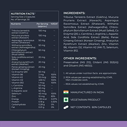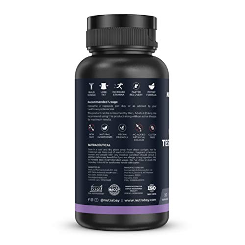 Nutrabay Pro Testosterone booster helps maintain testosterone levels required to boost Muscle Stamina Strength Muscle Performance Endurance and Supports overall Wellbeing. Nutrabay Pro Testosterone Supplement contains Gokhru Kawach Shatavari Ashwagandha Safed Musli Korean Ginseng and Co Enzyme Q 10. This is one of the effective combination for Testosterone Support. This supplement will help you amplify your training performance with better muscle definition muscle repair and recovery after the toughest workout sessions. It can be consumed by anyone daily for the best result. Non-GMO Gluten-Free Does NOT Contain Soy Dairy Yeast Eggs Corn Nuts Caffeine Additives Preservatives or Coloring. Consume 2 capsules daily with or after meal or as suggested by healthcare professionsal / dietician. This product can be consumed by Adults Elderly Men & Women.