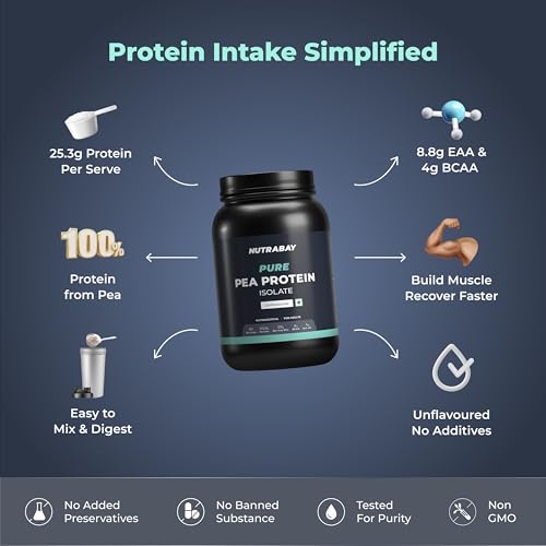 Nutrabay Pure Pea Protein is 100% Vegetarian Plant based Protein from vegetable (Peas) with complete amino acid profile for Vegans. One of the best non-dairy Gluten Free Soy Free Lactose free source of protein. Nutrabay Pure Pea Protein Isolate is Plant based Protein with a complete amino acid profile which delivers 25.3g Protein & 5g BCAA per serve. Best option for Gym Goers Athletes and Sports Enthusiasts who do intense training. Nutrabay Pea Protein is unflavoured in nature which gives you the freedom to add the flavor of your choice. Lactose Free No Amino Spiking No Artificial Colour No fillers No Added Sugar Gluten Free and No Banned Substances. This vegan plant protein is ideal as a post-workout supplement as it helps with Muscle growth Build Lean muscle Enhances recovery Supports Healthy Metabolism Boosts Immunity and Reduces Muscle loss. Keto Diet Friendly - If you are on a Low Carb Diet or Keto Diet Nutrabay Pure Pea Vegan Plant Protein is for you. It has very low carbs which makes it ideal for all low carb diets and can be used with any recipe to make a High Protein Shake.