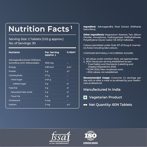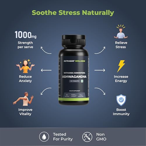 Nutrabay Wellness Ashwagandha is an advanced formulation which is a highly absorbable form of Ashwagandha. Take 2 Ashwagandha capsules daily with or after meal or as suggested by healthcare professional. Stress & Anxiety Reliever- Ashwagandha has been in use for hundreds of years as an herbal product and as supplement. It helps in controlling stress by reducing the level of stress hormone and promote calmness. Improved Overall Wellbeing - Nutrabay Ashwagandha provides health benefits to Improve Vitality Stamina & Boosts Immunity. It is GMO free and No additives or fillers hence it is Vegan safe. Improves Cognitive functions - Ashwagandha helps to strengthens the neurons (functional unit of the brain) which can help to improve cognitive functions like learning concentration memory etc. Reduces Fatigue - Ashwagandha enhances the capacity of cells to generate more energy which overall increases the individualÂÂs energy and reduces fatigue.
