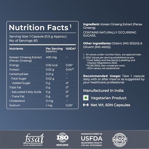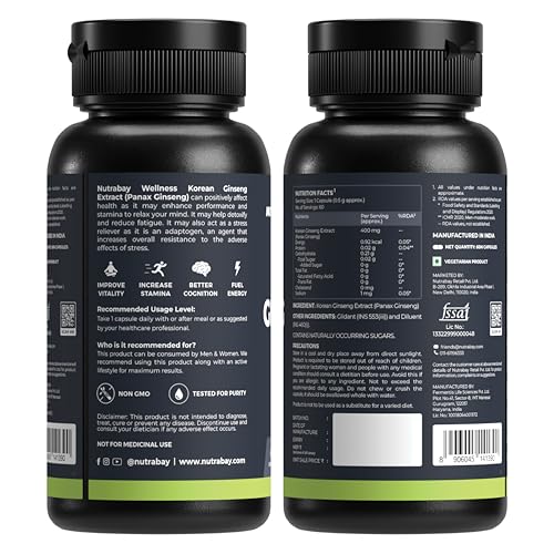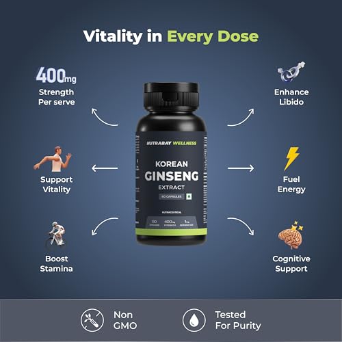 Nutrabay Wellness Korean Ginseng contains a wide array of nutrients including antioxidants vitamins minerals and intriguing compounds called ginsenosides and provide a powerful boost to energy and stamina in men and women. Korean Ginseng Capsules help elevate mood and relieve stress effectively. It will help keep your mind in the task you take and also help you get things done with enhanced focus. Korean Ginseng works naturally to stimulate brain cells resulting in better concentration and cognitive thinking. It has proven to have effects on the cognitive functions such as attention working memory performance reaction time in the individuals. It can be consumed by anyone daily for the best result. Non-GMO Gluten-Free Does not Contain Soy Dairy Yeast Eggs Corn Nuts Caffeine Additives Preservatives or Coloring. Consume 1 capsule daily before or after meal or as suggested by healthcare professionsal / dietician. This product can be consumed by Adults Elderly Men & Women.