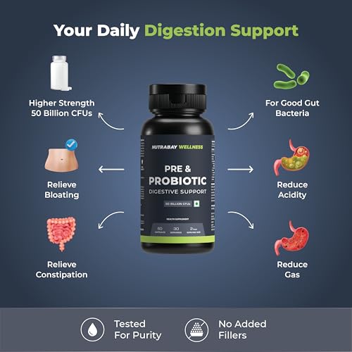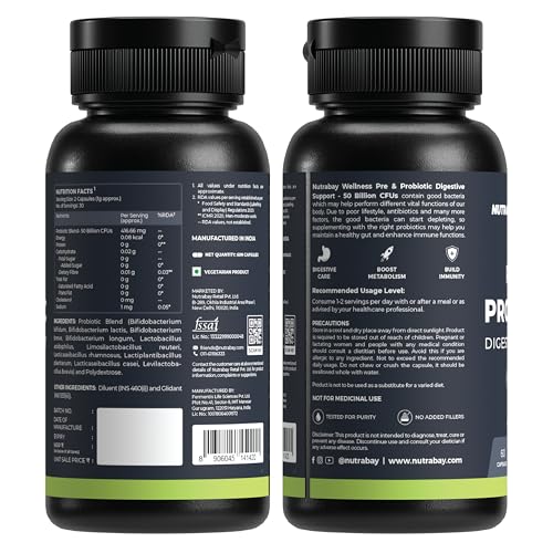 Nutrabay Wellness Pre & Probiotic consists of a Total of 25 Billion CFU with Probiotic Strains which are most beneficial for the health of your gut and your Immunity booster. Prebiotics act as Food for Probiotics which not only keep the Probiotics alive in the capsule but also help the Probiotics already present in our gut to multiply. Added Prebiotics helps your body absorb the benefits of probotics in a much better way. Our high potency probiotic also offers the most beneficial strains of good bacteria to help promote optimal health benefits. Probiotics can help the body relieve form gas bloating and heaviness. Since 70% of the immune system is in your gut adding more good bacteria with our superior prebiotics and probiotics capsules for good digestion helps support a healthy bacterial balance in your digestive tract and boosts immunity. Our Pre & Probiotics capsules are GMO-free 100% Vegan Made from Natural Ingredients Gluten Free Soy Free Dairy Free Sugar Free and Made in India to ensure the highest standards of safety and quality.
