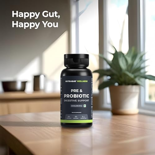 Nutrabay Wellness Pre & Probiotic Digestive Support 25 Billion CFUs - Improves Digestion & Immunity, Probiotic Supplement for Men and Women - 60 Veg Capsules