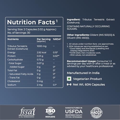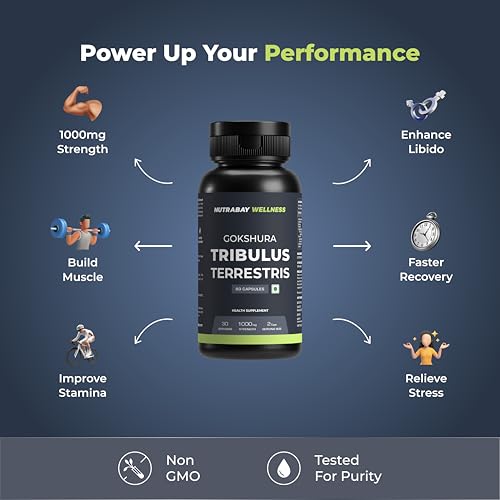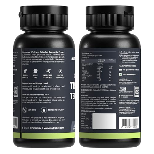 Nutrabay Wellness Tribulus Terrestries (Gokshura) curated for bodybuilders gym-goers and active people to help boost your athletic performance. Tribulus Gokshura 1000 mg is a potent ayurvedic supplement that offers 1000 mg of Tribulus Gokshura per serving standardized to 20% saponins. It may increase natural testosterone levels resulting in better muscle building and strength. This herbal supplement may be useful in improving Stamina and decreasing Fatigue. As a result you perform better at the gym. It boosts the nitric oxide levels to help enhance pump during workouts. It can be consumed by anyone daily for the best result. Non-GMO Gluten-Free Does NOT Contain Soy Dairy Yeast Eggs Corn Nuts Caffeine Additives Preservatives or Coloring. Consume 2 capsules daily with or after meal or as suggested by healthcare professionsal / dietician. This product can be consumed by Adults Elderly Men & Women.