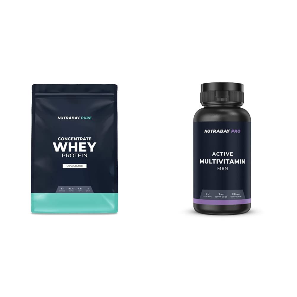 Nutrabay Whey Protein Concentrate (Unflavoured) - 1 kg | Raw Whey from USA | 33 servingsNutrabay Pure 100% Whey Protein Concentrate is designed to give you a rich protein source for building muscle and faster recovery. We use one of the highest quality ingredients available in the market to ensure that you get the best results. It's high protein content makes it the protein of choice.Nutrabay Pro Multivitamin for Men - 500mg 60 CapsNutrabay Pro Multivitamin for men is an advanced formula which contains 25 essential vitamins and minerals to support you with your goals. Each capsule includes nutrients that boost your everyday wellbeing while you stay active and keep up with a busy lifestyle. This Multivitamin has been specially tailored to make it the perfect supplement for active men.