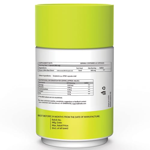 • Dosage: It is recommended to take one Green Coffee Capsule two times a day before breakfast and dinner with lukewarm water or as directed by your dietician.