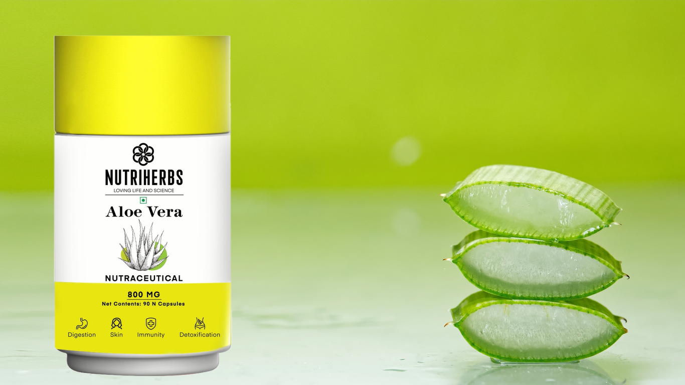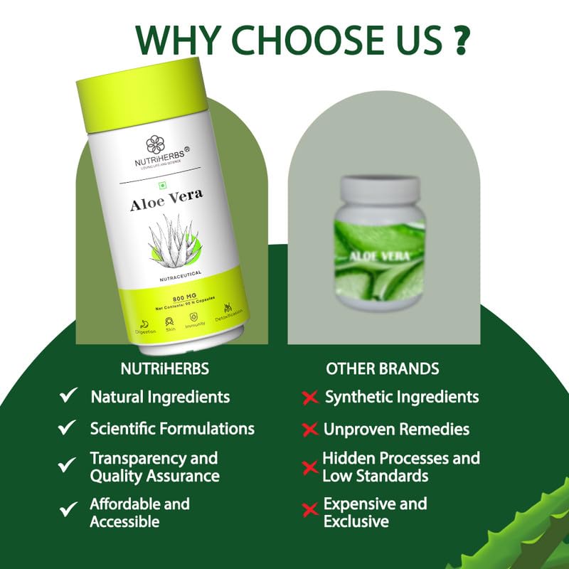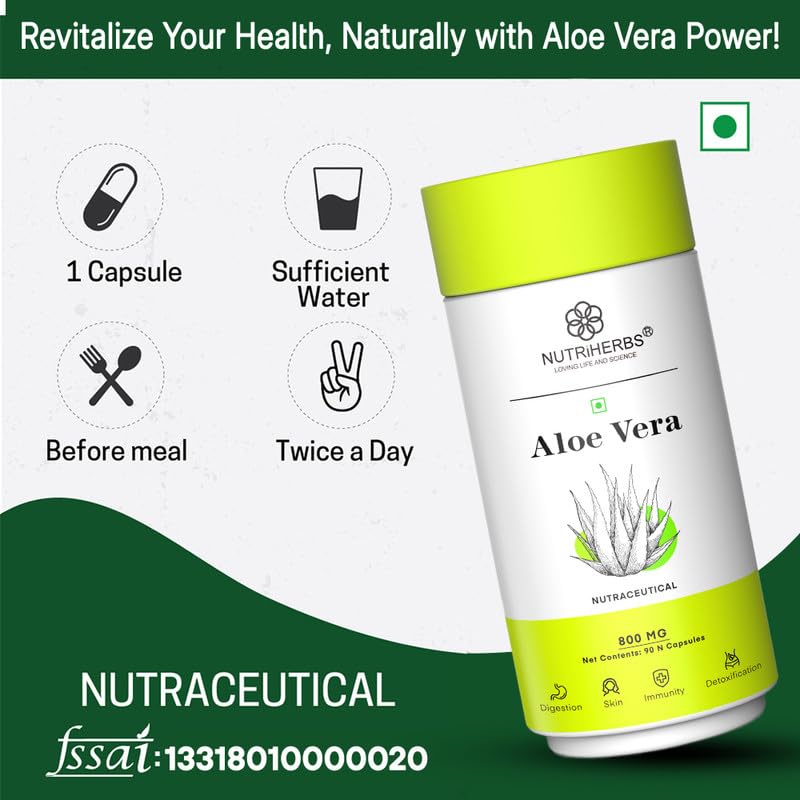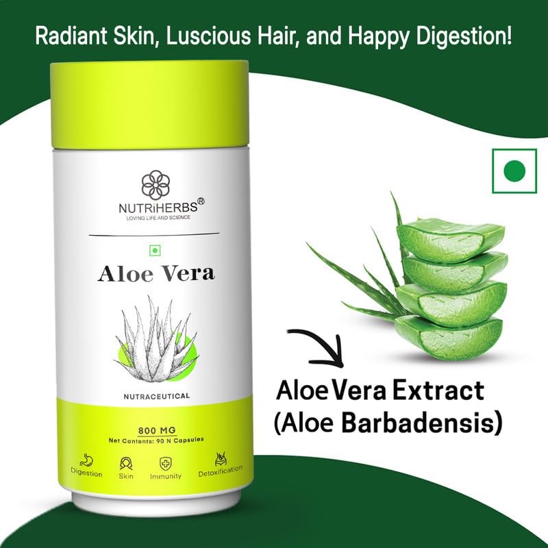 NUTRiHERBS Aloe Vera Capsules 800mg | Pure Aloe Vera Extract for Skin, Hair, Immunity & Digestion | Herbal Skin Care & Digestive Health Supplement (90 Capsules)