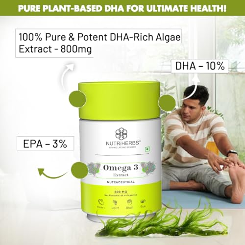 NUTRiHERBS Omega 3 800mg Capsules | Plant-Based DHA & EPA Supplement for Heart, Joint, Eye Health | Omega 3 Fatty Acids for Brain Support, Skin Wellness | for Men & Women (60 Capsules)