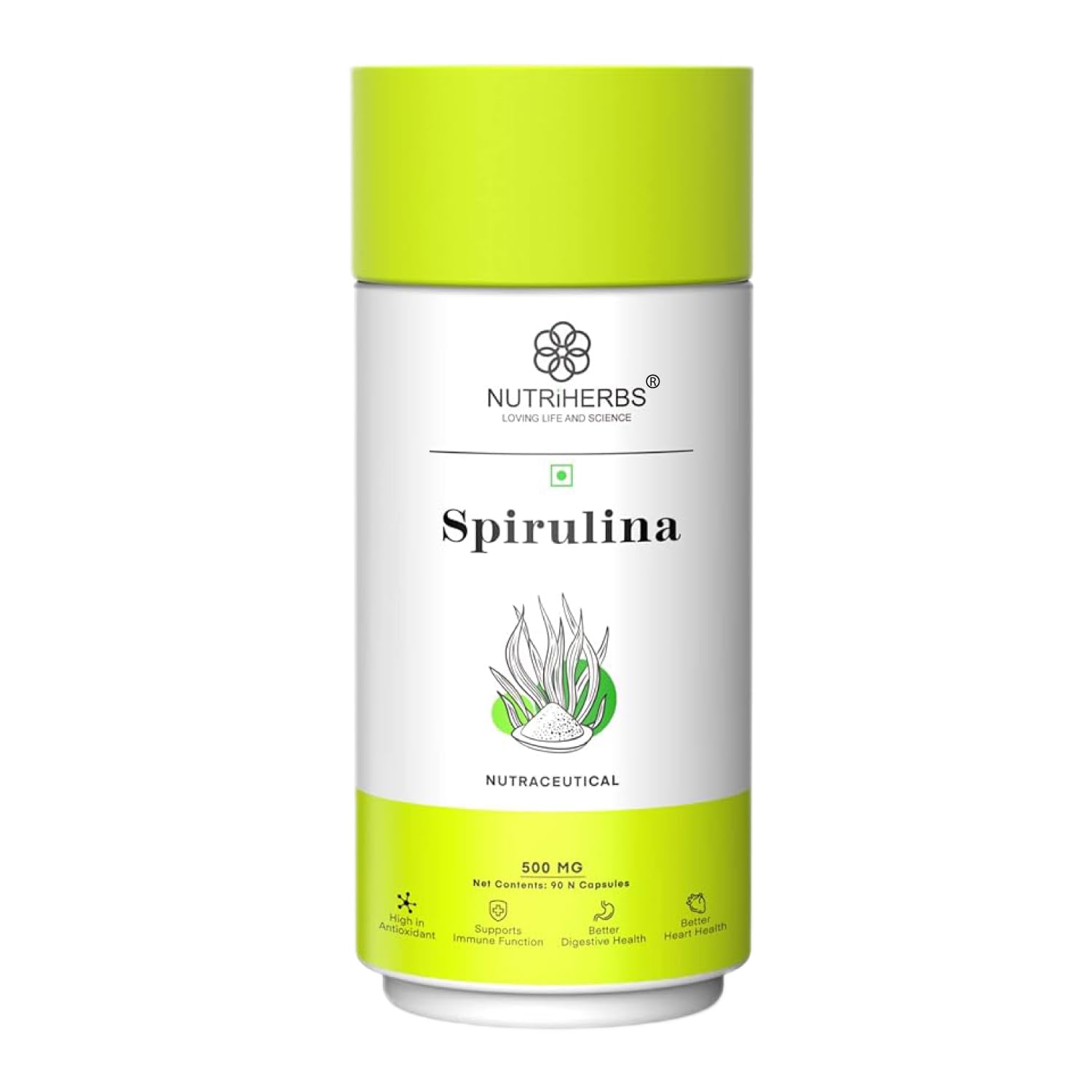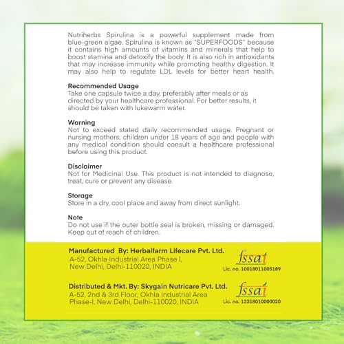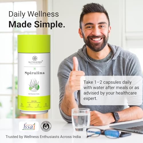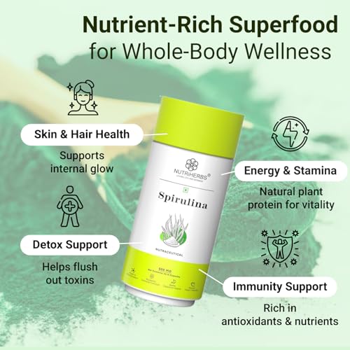 • Nutriherbs Spirulina capsules may help in the overall physical rejuvenation of the body. It also helps in improving gut health and regulation of the digestive system. Due to the presence of powerful antioxidant and high protein content it may promote musc