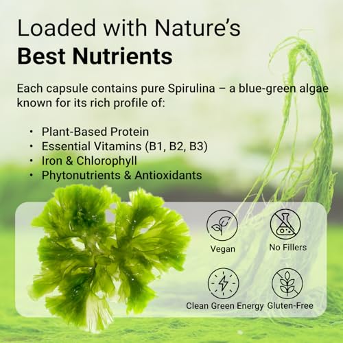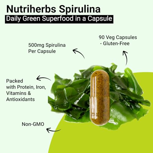 NUTRiHERBS Spirulina Capsules 800mg | Organic Superfood & High Protein Supplement | Supports Immunity, Weight Management, Hair Growth, Brain Health, and Stress Relief | Rich in Antioxidants & Minerals | 90 Capsules