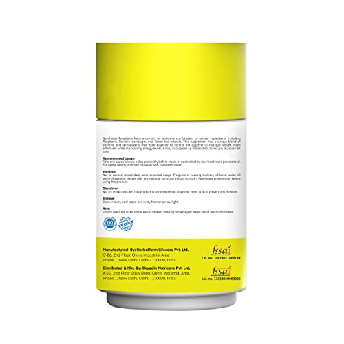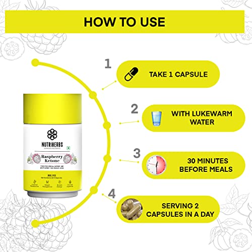 • Dosage: Take one capsule of Nutriherbs Raspberry ketone two times a day 30 minutes before breakfast and dinner with luke warm water or as directed by your healthcare professional.