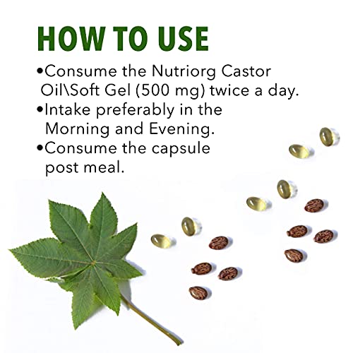 How to Use: Consume the Nutriorg Castor Oil Soft Gel (500 mg) twice a day. Intake preferably in the Morning and Evening. Consume the capsule post meal.
