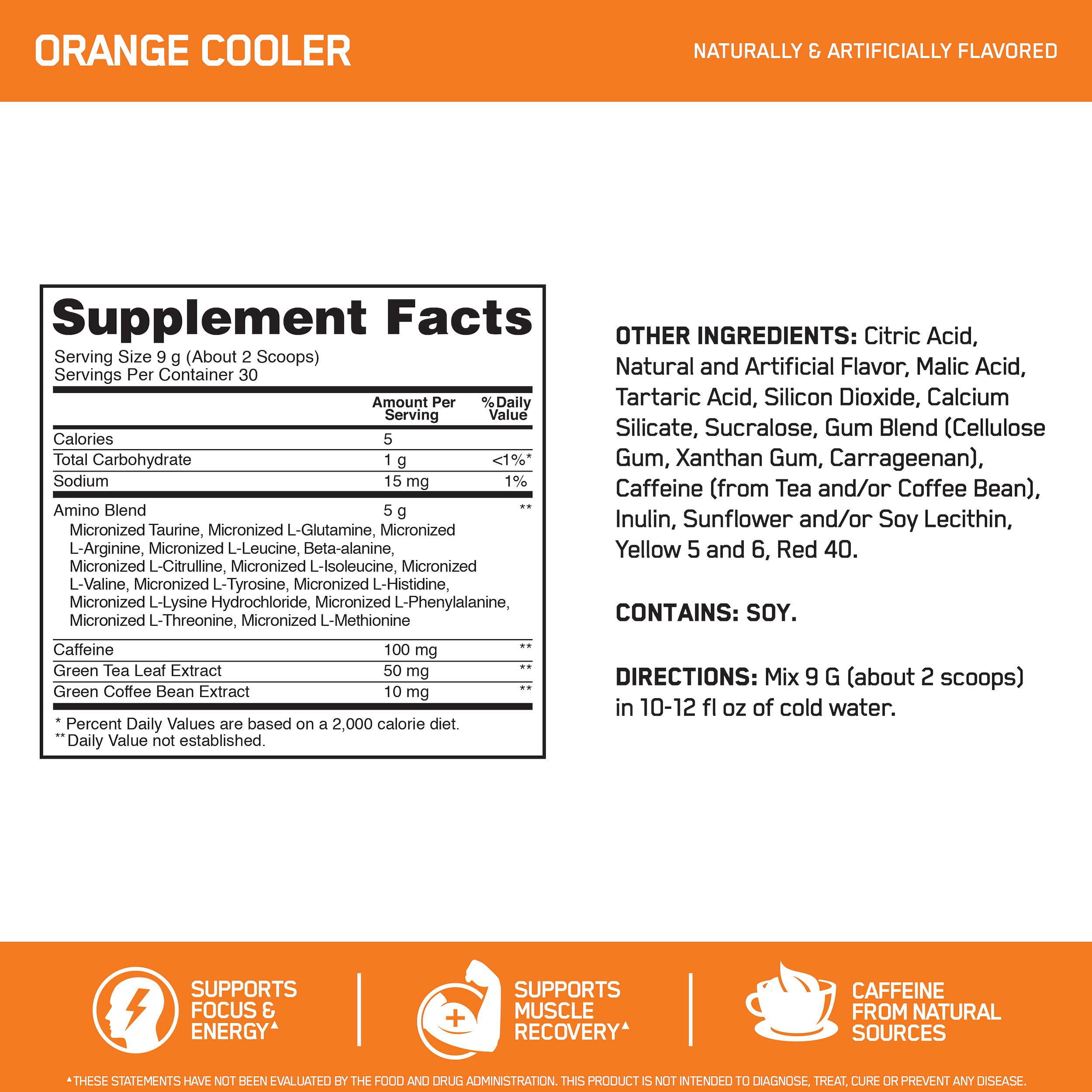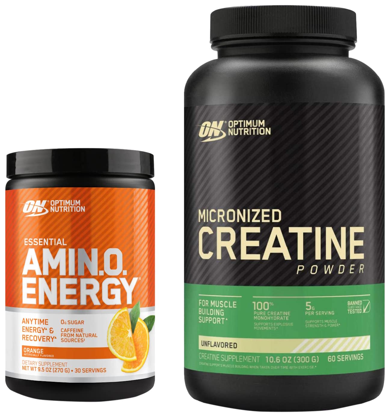 Optimum Nutrition Amino Energy Amino Acids BCAA Anytime Energy Formula Supports Energy & Focus 270gm Orange (30 serves)Mix up ESSENTIAL AMIN.O. ENERGY anytime you want a boost of energy focus and muscle recovery support. Each serving provides 100 mg of caffeine from natural sources to support energy and focus along with 5 grams of amino acids. Category creating unique formula that delivers caffeine from natural source with essential amino acids and it all comes in refreshing fruit flavors. Taste-Energy-Focus-Recovery & all with Zero Sugar you can now have it ALL!Optimum Nutrition (ON) Micronized Creatine Powder - 250 Gram 83 Serves 3g of 100% Creatine Monohydrate per serve Supports Athletic Performance & Power Unflavored.Creatine is naturally produced in our body and it is used in the recycling of ATP which is our bodyâs energy currency. Creatine monohydrate is one of the most well-researched sports nutrition ingredients. When used in combination with regular weight training it has been shown to support athletic performance and power.