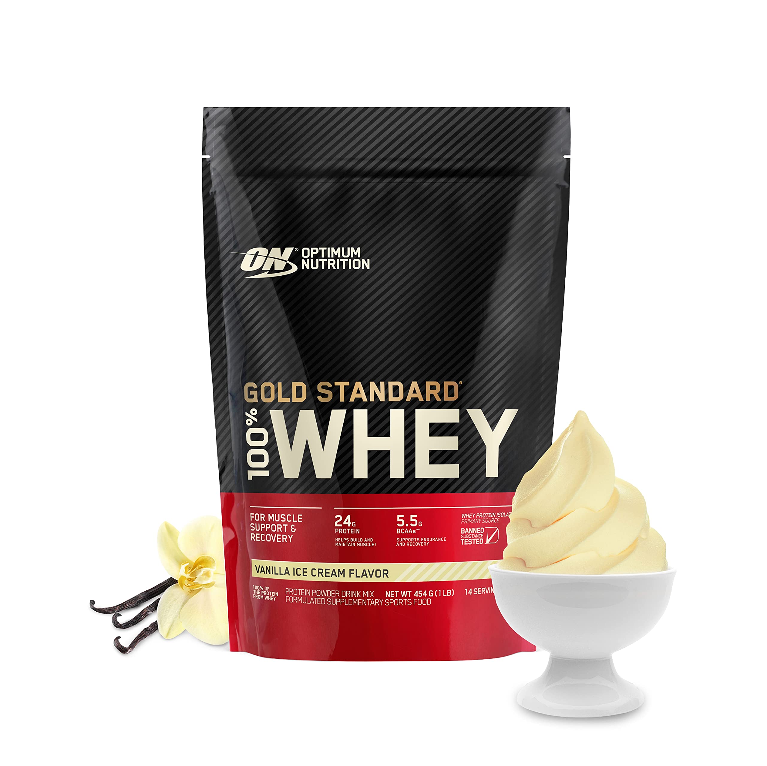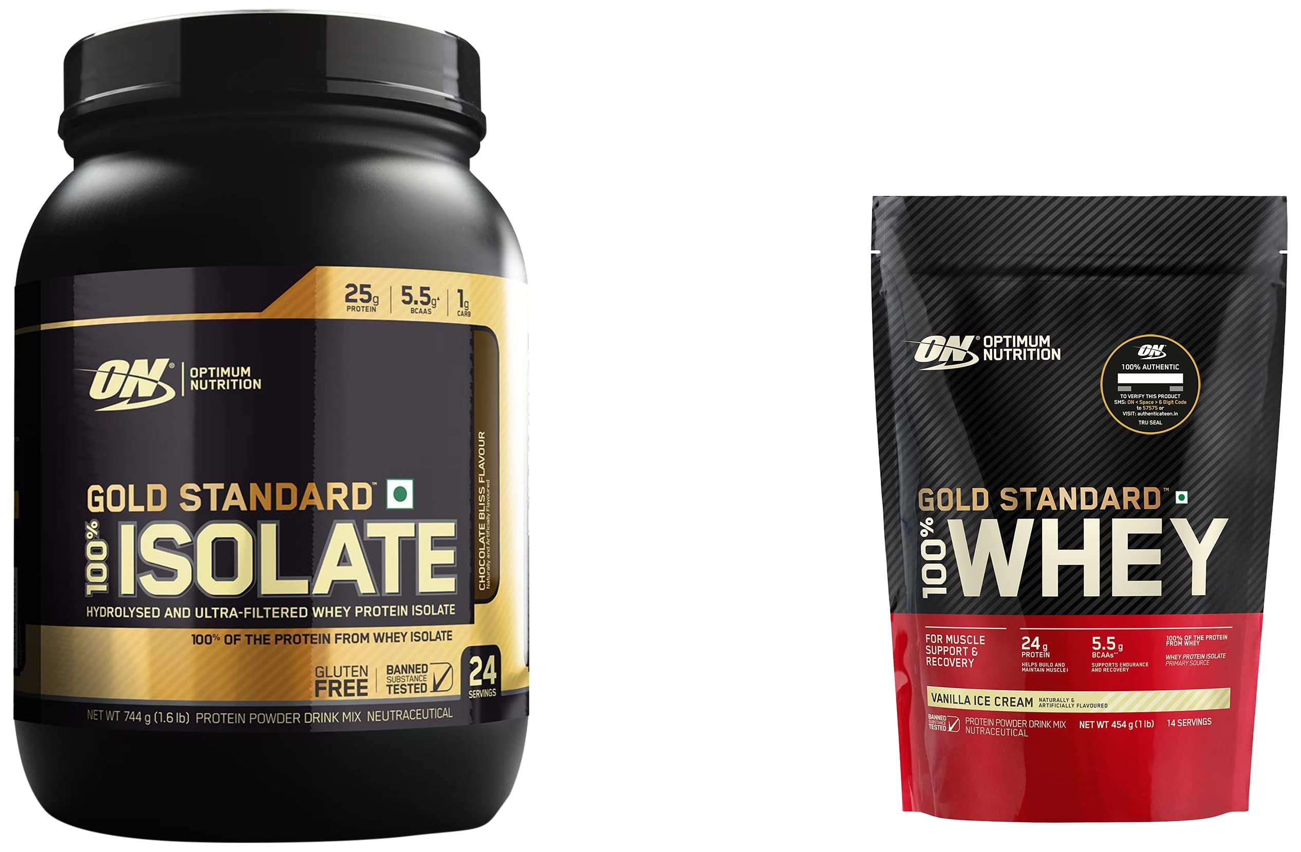 Optimum Nutrition (ON) Gold Standard 100% Isolate 1.6 lb 744 g (Chocolate Bliss) for Muscle Support & Recovery Vegetarian - 100% Protein from Whey IsolateTo create GOLD STANDARD 100% ISOLATE we start by selecting only the highest quality whey protein which undergoes a series of sophisticated filtration processes to âisolateâ out excess fat cholesterol and sugar. A portion of this Whey Protein Isolate is then hydrolyzed â broken down into smaller chains of amino acids. The final product is a fast-digesting complete protein containing no more than 1 gram of carbohydrates less than a gram of fat and more than 80% pure protein per serving to support your muscle building performance and fitness goals.Optimum Nutrition (ON) Gold Standard 100% Whey Protein Powder 1 lbs 454 g (Vanilla Ice Cream) for Muscle Support & Recovery Vegetarian - Primary Source Whey IsolateOptimum Nutrition's Gold Standard 100% Whey uses pure Whey Protein Isolates as the primary ingredient. Combined with ultra-filtered whey protein concentrate each serving provides 24 grams of all-whey protein and 5.5 grams of naturally occurring Branched Chain Amino Acids (BCAAs) which are prized by athletes for their muscle building qualities. With 10 tempting flavors to choose from ON Gold Standard 100% Whey gives you plenty of ways to keep workout recovery interesting. To instantly check the authenticity of your ON product SMS us your 6 digit unique code (on the pack) at 57575 or visit our wesite AUTHENTICATEON.in