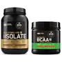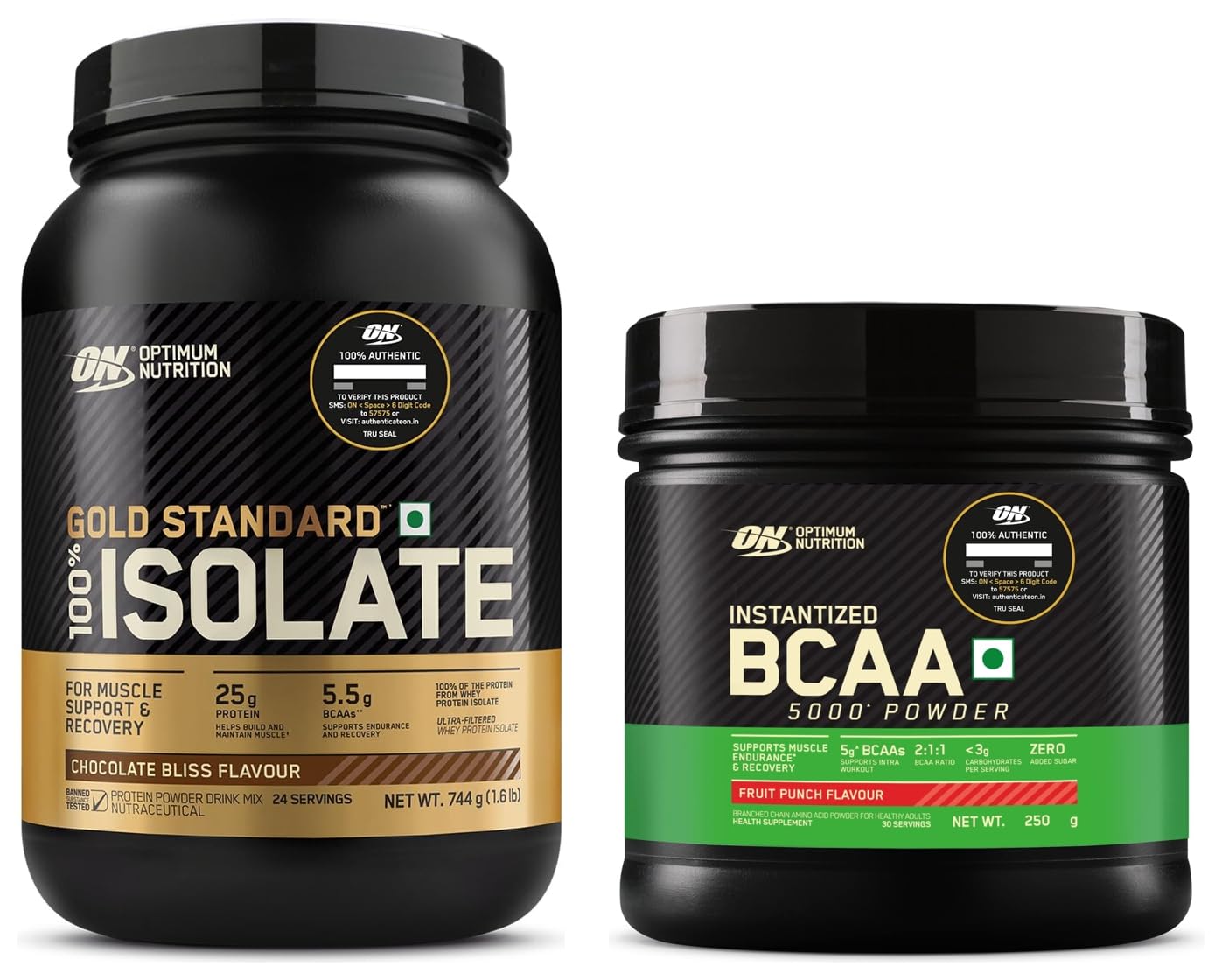 Optimum Nutrition (ON) Gold Standard 100% Isolate 1.6 lb 744 g (Chocolate Bliss) for Muscle Support & Recovery Vegetarian - 100% Protein from Whey IsolateTo create GOLD STANDARD ISOLATE we start by selecting only the highest quality whey protein which undergoes a series of sophisticated filtration processes to âisolateâ out excess fat cholesterol and sugar. A portion of this Whey Protein Isolate is then hydrolyzed â broken down into smaller chains of amino acids. The final product is a fast-digesting complete protein containing no more than 1 gram of carbohydrates less than a gram of fat and more than 80% pure protein per serving to support your muscle building performance and fitness goals.Optimum Nutrition BCAA 5g BCAAs in 2:1:1 Ratio 30 servings For Muscle Recovery & Endurance Intra workout Informed Choice certified (250gm Fruit Punch)BCAA 5000 Powder by Optimum Nutrition delivers five grams of BCAAs per serving in the preferred 2:1:1 ratio of leucine to isoleucine and valine to support muscle recovery and endurance. Itâs instantized for easy mixing into water juice or post-workout shakes. Each 250gm has 30 servings and comes in two delicious flavours.