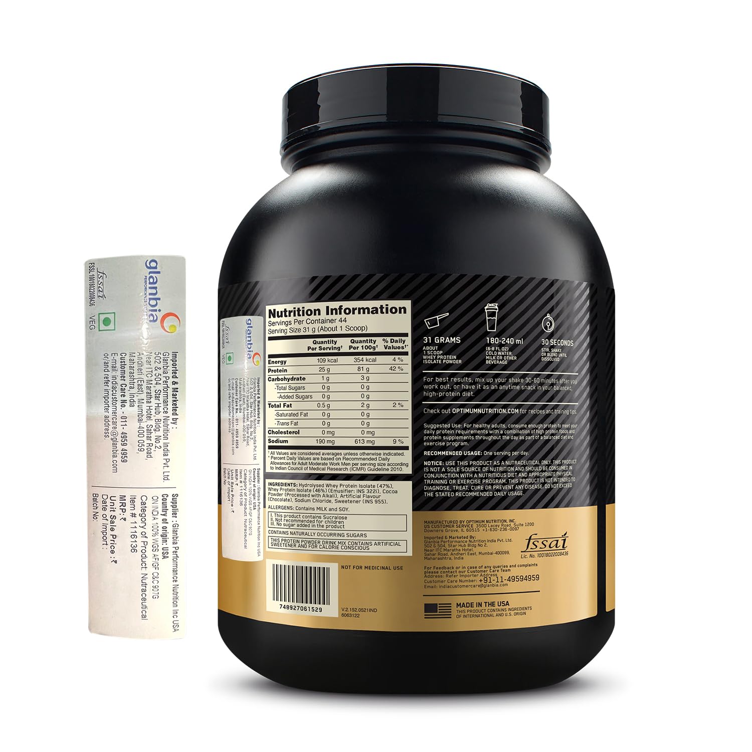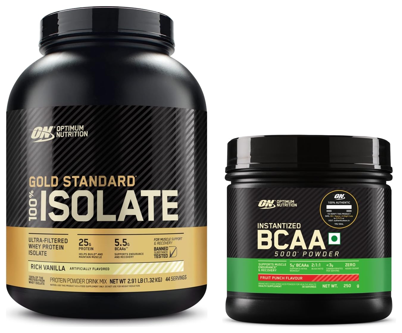 Optimum Nutrition (ON) Gold Standard 100% Isolate 3 lbs 1.36 kg (Chocolate Bliss) for Muscle Support & Recovery Vegetarian - 100% Protein from Whey IsolateTo create GOLD STANDARD ISOLATE we start by selecting only the highest quality whey protein which undergoes a series of sophisticated filtration processes to âisolateâ out excess fat cholesterol and sugar. A portion of this Whey Protein Isolate is then hydrolyzed â broken down into smaller chains of amino acids. The final product is a fast-digesting complete protein containing no more than 1 gram of carbohydrates less than a gram of fat and more than 80% pure protein per serving to support your muscle building performance and fitness goals.Optimum Nutrition BCAA 5g BCAAs in 2:1:1 Ratio 30 servings For Muscle Recovery & Endurance Intra workout Informed Choice certified (250gm Fruit Punch)BCAA 5000 Powder by Optimum Nutrition delivers five grams of BCAAs per serving in the preferred 2:1:1 ratio of leucine to isoleucine and valine to support muscle recovery and endurance. Itâs instantized for easy mixing into water juice or post-workout shakes. Each 250gm has 30 servings and comes in two delicious flavours.