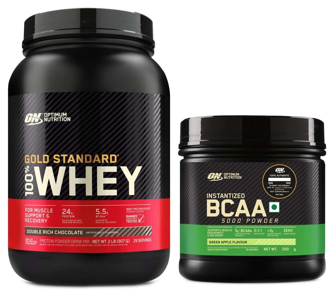 Optimum Nutrition (ON) Gold Standard 100% Whey (2 lbs/907 g) (Double Rich Chocolate) Protein Powder & Optimum Nutrition BCAA 5g BCAAs in 2:1:1 Ratio 30 servings (250gm Green Apple) COMBO