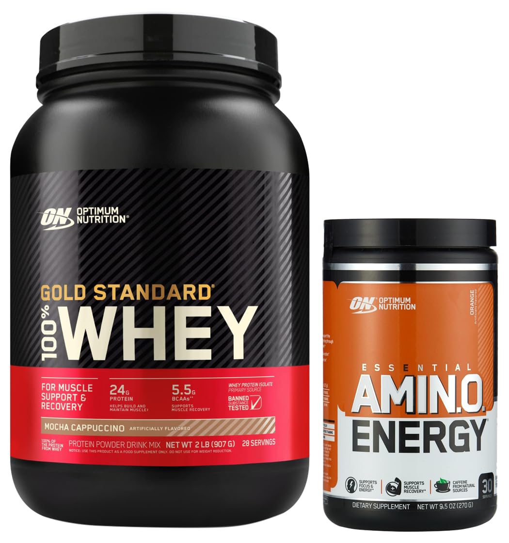 Optimum Nutrition (ON) Gold Standard 100% Whey Protein Powder 2 lbs 907 g (Mocha Cappuccino) for Muscle Support & Recovery Veg Primary Source Whey IsolateOptimum Nutrition's Gold Standard 100% Whey uses pure Whey Protein Isolates as the primary ingredient. Combined with ultra-filtered whey protein concentrate each serving provides 24 grams of all-whey protein and 5.5 grams of naturally occurring Branched Chain Amino Acids (BCAAs) which are prized by athletes for their muscle building qualities. With 10 tempting flavors to choose from ON Gold Standard 100% Whey gives you plenty of ways to keep workout recovery interesting. To instantly check the authenticity of your ON product SMS us your 6 digit unique code (on the pack) at 57575 or visit our wesite AUTHENTICATEON.inOptimum Nutrition (ON) Amino Energy - Pre Workout with Green Tea Extract BCAA Amino Acids Green Coffee Extract Energy Powder - Orange Cooler 30 ServingsMix up ESSENTIAL AMIN.O. ENERGY anytime you want a boost of energy focus and muscle recovery support. Each serving provides 100 mg of caffeine from natural sources to support energy and focus along with 5 grams of amino acids. Category creating unique formula that delivers caffeine from natural source with essential amino acids and it all comes in refreshing fruit flavors. Taste-Energy-Focus-Recovery & all with Zero Sugar you can now have it ALL!