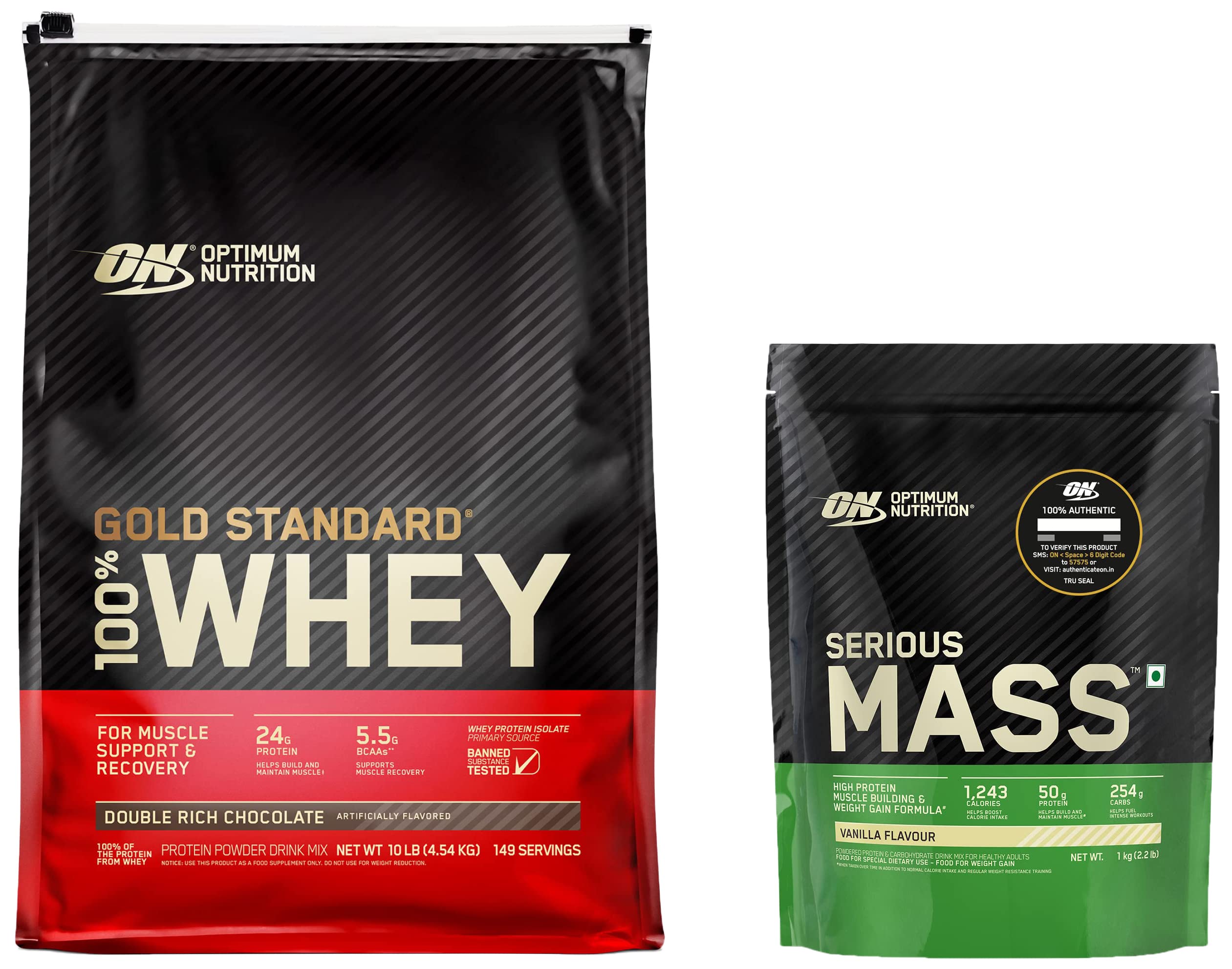 Optimum Nutrition (ON) Gold Standard 100% Whey Protein Powder- 4 kg 131 servings (Double Rich Chocolate) for Muscle Support & Recovery Vegetarian - Primary Source Whey IsolateOptimum Nutrition's Gold Standard Whey uses pure Whey Protein Isolates as the primary ingredient. Combined with ultra-filtered whey protein concentrate each serving provides 24 grams of all-whey protein and 5.5 grams of naturally occurring Branched Chain Amino Acids (BCAAs) which are prized by athletes for their muscle building qualities. With 10 tempting flavors to choose from ON Gold Standard Whey gives you plenty of ways to keep workout recovery interesting. To instantly check the authenticity of your ON product SMS ON 6 digit unique code on the pack at 57575 or visit our website A to instantly test the authenticity of the product.OPTIMUM NUTRITION (ON) Serious Mass Gainer (Veg) High Protein High Calorie Weight Gainer - Pack of 1 kg powder(Vanilla) with Vitamins & MineralsSERIOUS MASS is the ultimate weight gain and muscle building formula. With 1200+ calories per 2-scoop serving and 50 grams of protein to support muscle recovery this powder makes the ideal post-workout and between meals shake for sizing up your goals. SERIOUS MASS provides you with the tools you need to support your weight gain goals.