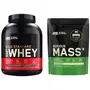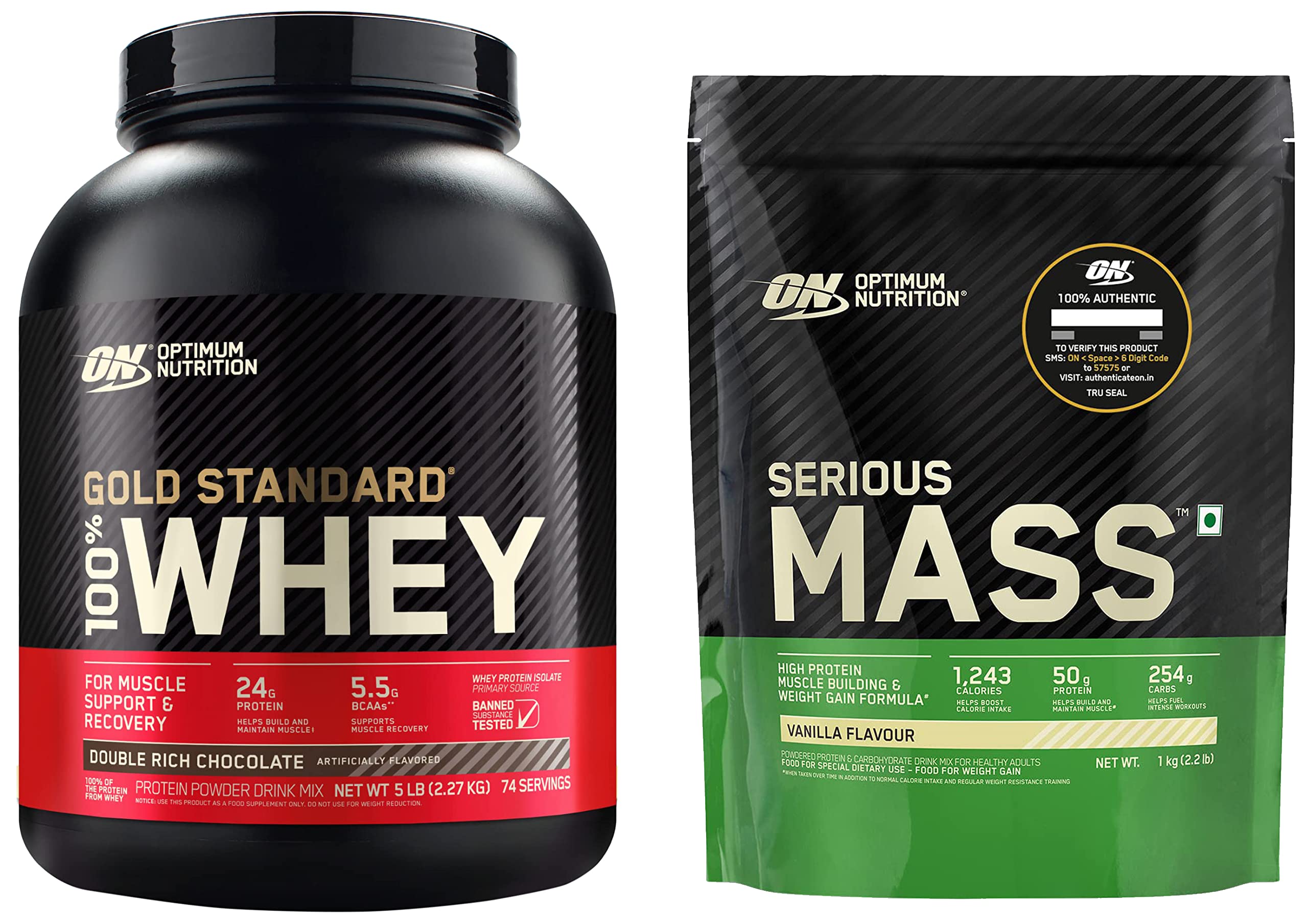 Optimum Nutrition (ON) Gold Standard 100% Whey Protein Powder - 5 lbs 2.27 kg (Double Rich Chocolate) Primary Source IsolateFor Men and WomenOptimum Nutrition's Gold Standard Whey uses pure Whey Protein Isolates as the primary ingredient. Combined with ultra-filtered whey protein concentrate each serving provides 24 grams of all-whey protein and 5.5 grams of naturally occurring Branched Chain Amino Acids (BCAAs) which are prized by athletes for their muscle building qualities. With 10 tempting flavors to choose from ON Gold Standard Whey gives you plenty of ways to keep workout recovery interesting. To instantly check the authenticity of your ON product SMS us your 6 digit unique code (on the pack) at 57575 or visit our wesite AUTHENTICATEON.inOPTIMUM NUTRITION (ON) Serious Mass Gainer (Veg) High Protein High Calorie Weight Gainer - Pack of 1 kg powder(Vanilla) with Vitamins & MineralsSERIOUS MASS is the ultimate weight gain and muscle building formula. With 1200+ calories per 2-scoop serving and 50 grams of protein to support muscle recovery this powder makes the ideal post-workout and between meals shake for sizing up your goals. SERIOUS MASS provides you with the tools you need to support your weight gain goals.