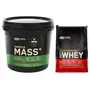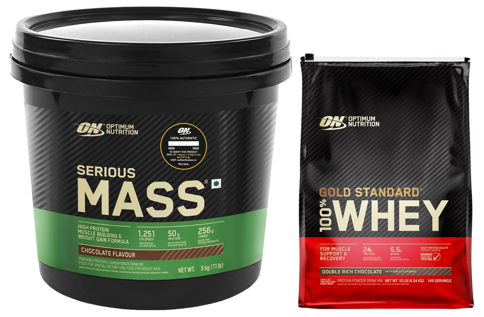 Optimum Nutrition (ON) Gold Standard 100% Whey Protein Powder- (Double Rich Chocolate) 4 kg 131 servings for Muscle Support & Recovery Vegetarian - Primary Source Whey IsolateOptimum Nutrition's Gold Standard Whey uses pure Whey Protein Isolates as the primary ingredient. Combined with ultra-filtered whey protein concentrate each serving provides 24 grams of all-whey protein and 5.5 grams of naturally occurring Branched Chain Amino Acids (BCAAs) which are prized by athletes for their muscle building qualities. With 10 tempting flavors to choose from ON Gold Standard Whey gives you plenty of ways to keep workout recovery interesting. To instantly check the authenticity of your ON product SMS ON 6 digit unique code on the pack at 57575 or visit our website A to instantly test the authenticity of the product.OPTIMUM NUTRITION (ON) Serious Mass Gainer powder (Veg) - Pack of 5 kg (Chocolate) Vitamins & Minerals High Protein High Calorie Weight Gainer with 3gm CreatineNow Suitable for Vegetarians SERIOUS MASS is the ultimate weight gain and muscle building formula. With +1200 calories per 2-scoop serving and 50 grams of protein to support muscle recovery this powder makes the ideal post-workout and between meals shake for sizing up your goals. SERIOUS MASS provides you with the tools you need to support your weight gains goals.
