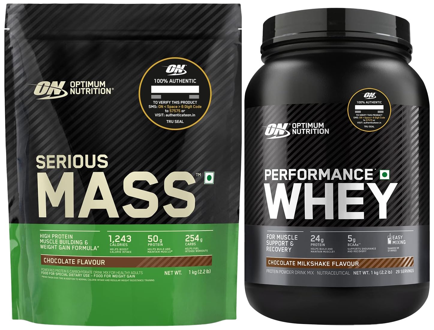 OPTIMUM NUTRITION Performance Whey Protein Powder Blend with Isolate 24g Protein 5g BCAA Chocolate 1 kgA High Quality Whey Protein derived from cowâs milk and is considered a complete protein because it contains all of the essential amino acids that can only be taken in through diet from the Worldâs #1 seller of Whey protein. Because of ultra-filtering and other processes ON Performance Whey has much of the fat carbohydrates and other undesirable components removed leaving you with an easy-to-mix powder providing 24 grams of whey protein with just 1 gram of sugar and 1 gram of fat.Optimum Nutrition (ON) Serious Mass High Protein High Calorie Weight Gainer Powder - 1 kg (Chocolate) with Vitamins and Minerals Suitable for VegetariansNow Suitable for Vegetarians SERIOUS MASS is the ultimate weight gain and muscle building formula. With +1200 calories per 2-scoop serving and 50 grams of protein to support muscle recovery this powder makes the ideal post-workout and between meals shake for sizing up your goals. SERIOUS MASS provides you with the tools you need to support your weight gains goals.