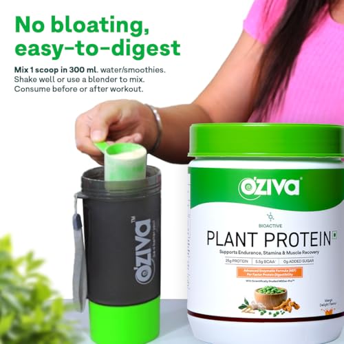 OZiva Bioactive Plant Protein (Mango) | 25g Protein, Pea Isolate| Vegan | No bloating, Easy to digest | All Essential Amino Acids| Plant Protein Powder | Clean, No Added Sugar, 500g + Shaker