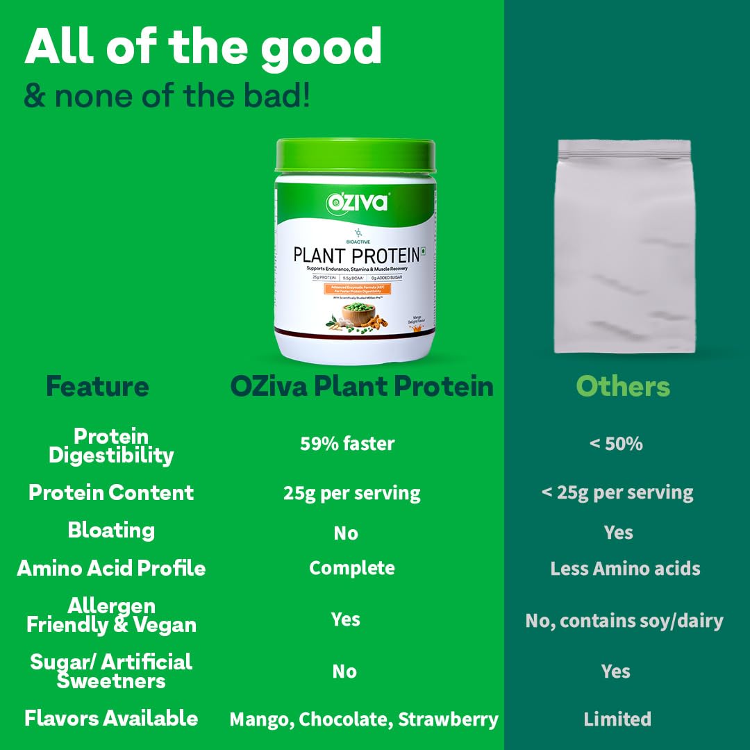 • Har Tarah Se Better with Key Plant-Based Ingredients - OZiva Bioactive Plant Protein is available in two delicious flavours - chocolate and mango. OZiva plant protein is vegan contains no artificial colours added sugar or artificial sweeteners.