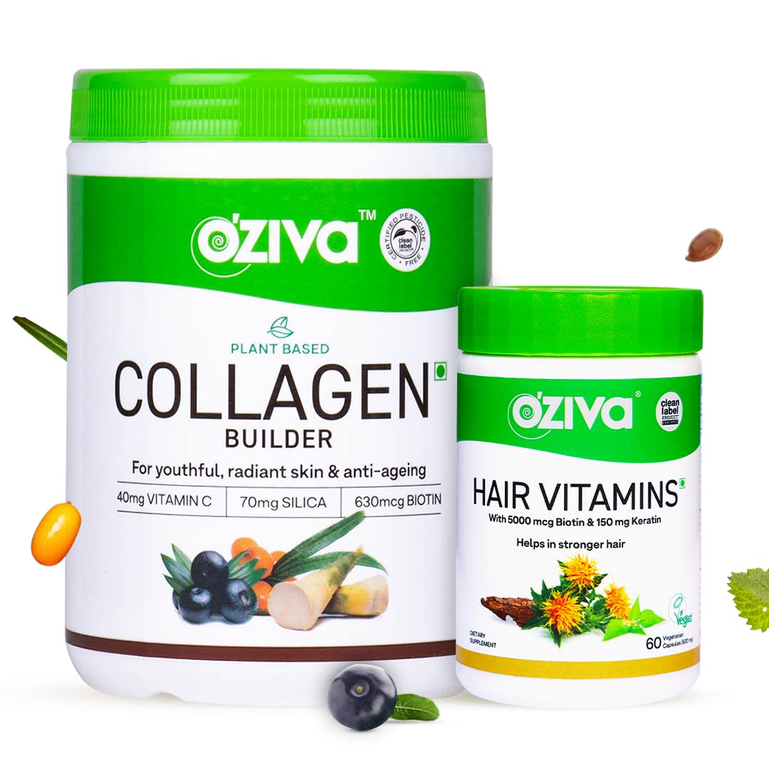 OZiva Hair & Skin Combo Pack Plant Based Collagen Builder 250 Gram Capsule+Hair Vitamin With Biotin Omega 3 & Vitamin C For Glowing Skin & Hair Fall Control