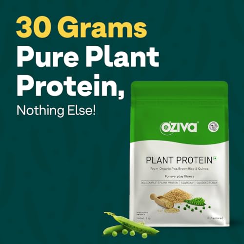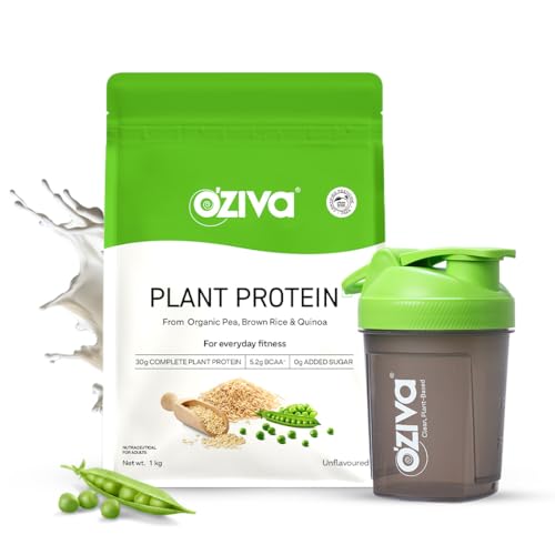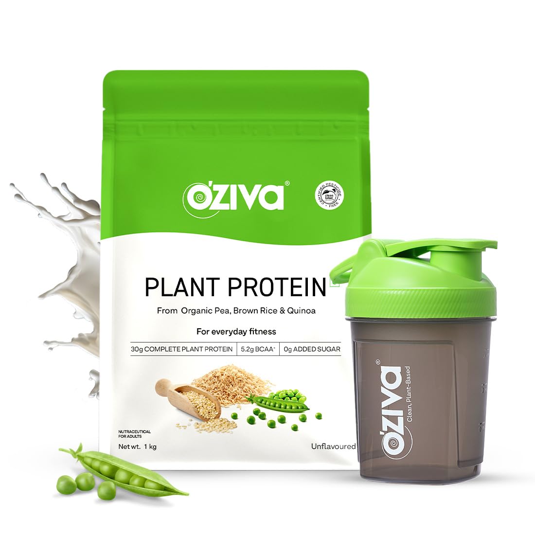 OZiva Organic Plant Protein for Everyday Fitness | 30g Protein - Pea Isolate | Complete Plant Protein Powder for Men & Women | No Added Sugar, Certified Clean & Vegan (Unflavoured, 1kg + shaker)