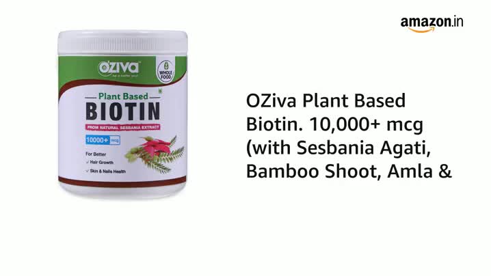 • WHOLEFOOD BIOTIN SUPPLEMENT FOR HAIR GROWTH: OZiva Plant Based Biotin for hair contains 10000 mcg of 100% natural Biotin derived from Sesbania Agati extracts. The proprietary blend of SesZenBio in OZiva Biotin helps stimulate hair follicles up to 2 times