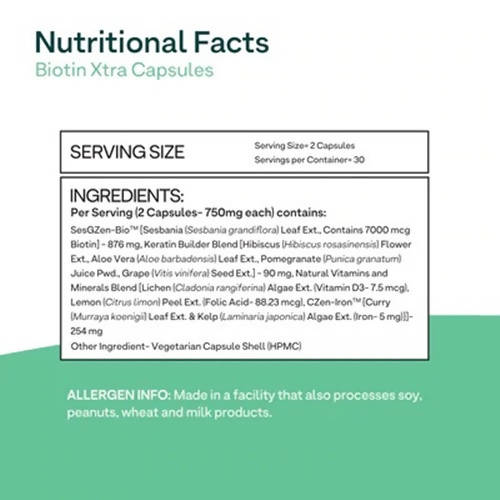 OZiva Plant Based Biotin Xtra CapsulesIngredients:Aloe Vera, HibiscusDirections of use:Consume 2 capsules daily, one hour before or two hours after the meal.Consume regularly for at least 3-6 months for best results.Legal Disclaimer: Statements regarding dietary supplements have not been evaluated by the FDA.Note: Product images are for illustrative purposes only. Images/packaging/ labels may vary from time to time due to changes made by the manufacturer's manufacturing batch and location. The product desc