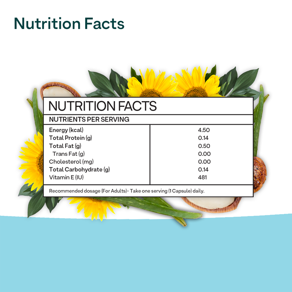 OZiva Plant Based Natural Vitamin E (With Argan oil + Aloe vera) -30 Cap:It is useful for glowing skin & strong hair. It may help repair dry scalp, improve hair texture & supports shining hair, reduces acne, dark spots & blemishes.Soy freeGluten freeNon GMONo sugarNo trans fatLactose freeNo preservativesNo artificial sweetenersIngredients:Sunflower OilArgan OilAloe VeraManufacturer: OZivaQuantity: 30 CapsulesNote: May contain additional ingredients. The product description is for information purposes only and it is always better to consume/use products after reading the labels on the products or as prescribed by the physician.Legal Disclaimer: Statements regarding dietary supplements have not