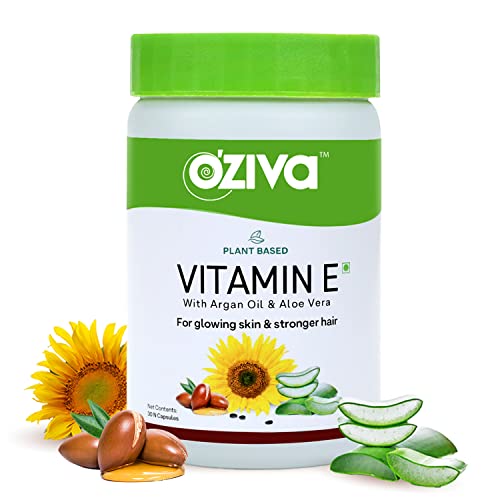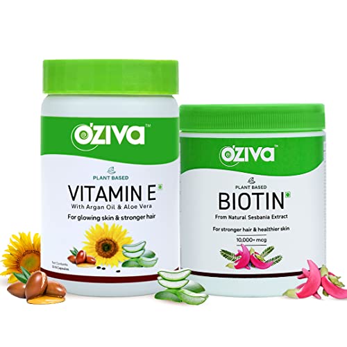 OZiva Plant Based Natural Vitamin E (With Sunflower Oil & Argan Oil) For Face & Skin Glow,30 Capsules & Plant Based Biotin 10000+ Mcg (With Natural Sesbania Agati Extract),125G (Combo Pack)