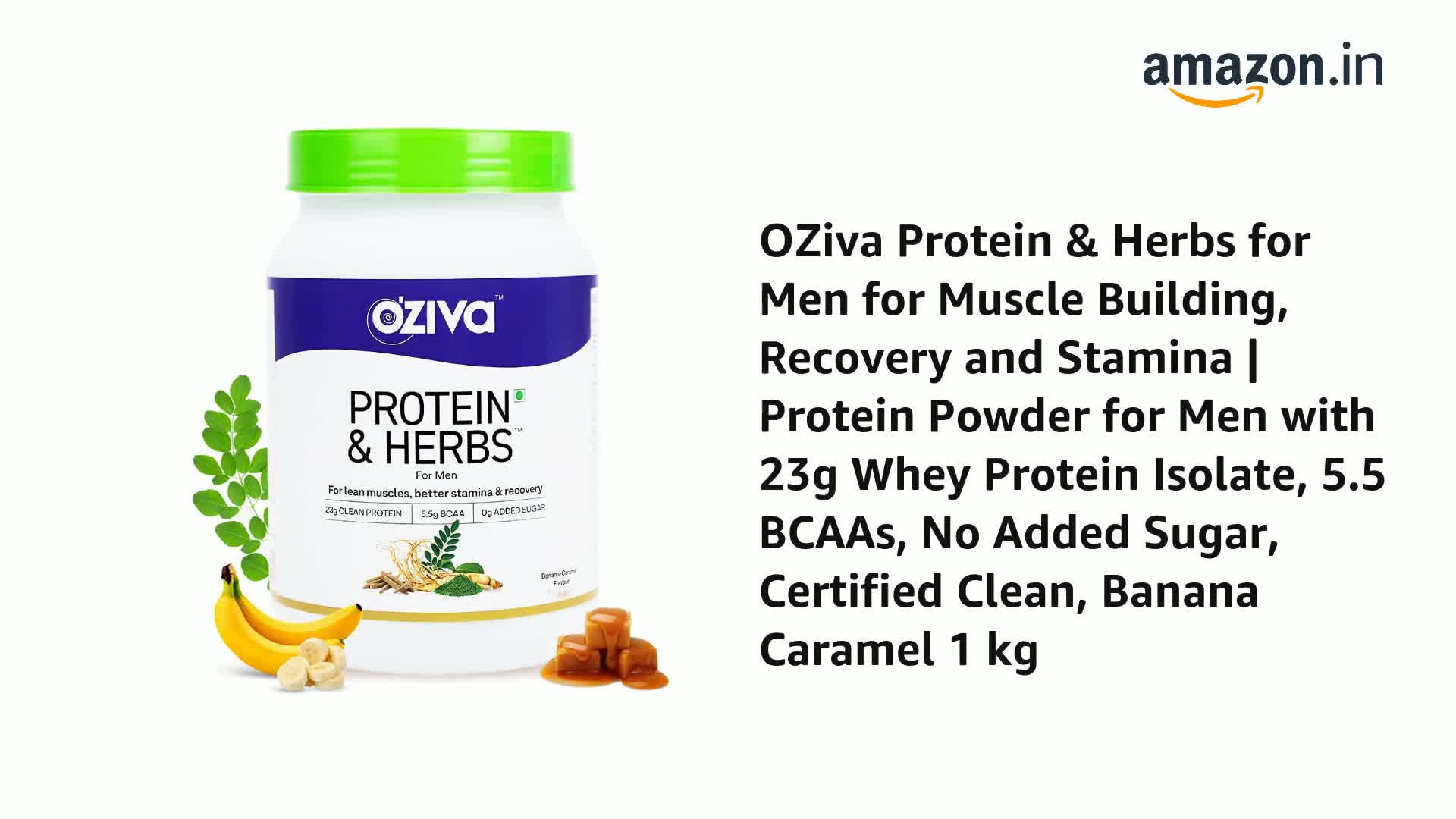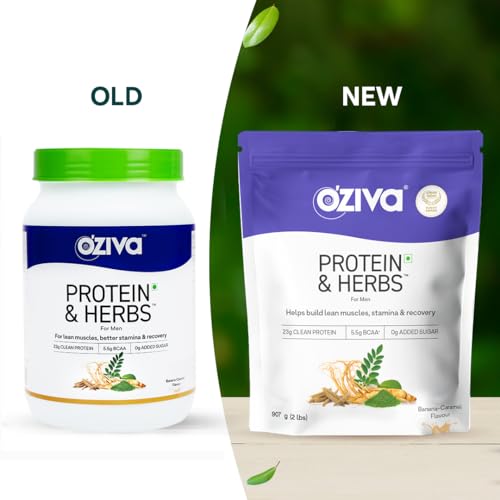OZiva Protein & Herbs for Men (Banana Caramel) I Muscle Building, Stamina & Recovery | Clean Protein, Shatavari, Green Tea I No Added Sugar, 2lbs (907gm)