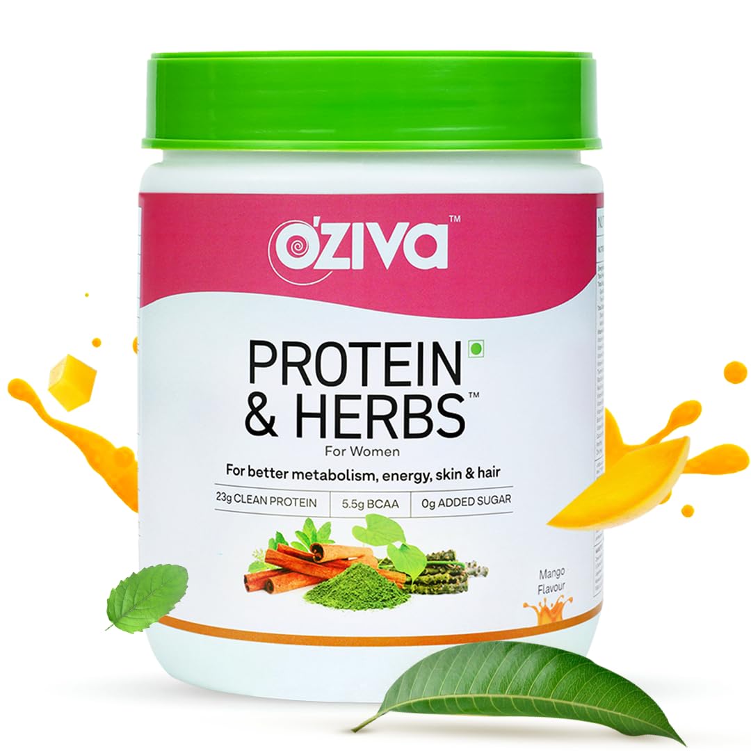 OZiva Protein & Herbs for Women (Mango) to Reduce Body Fat Manage Weight & Metabolism | Protein Powder for Women with 23g Whey Protein No Added Sugar Certified Clean 500gm