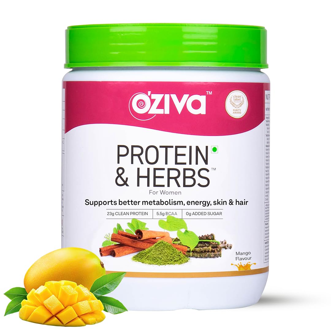 OZiva Protein & Herbs for Women (Mango) I Manage Weight, Energy & Metabolism | Clean Protein, Shatavari, Green Tea I No Added Sugar, 1lbs (453gm)