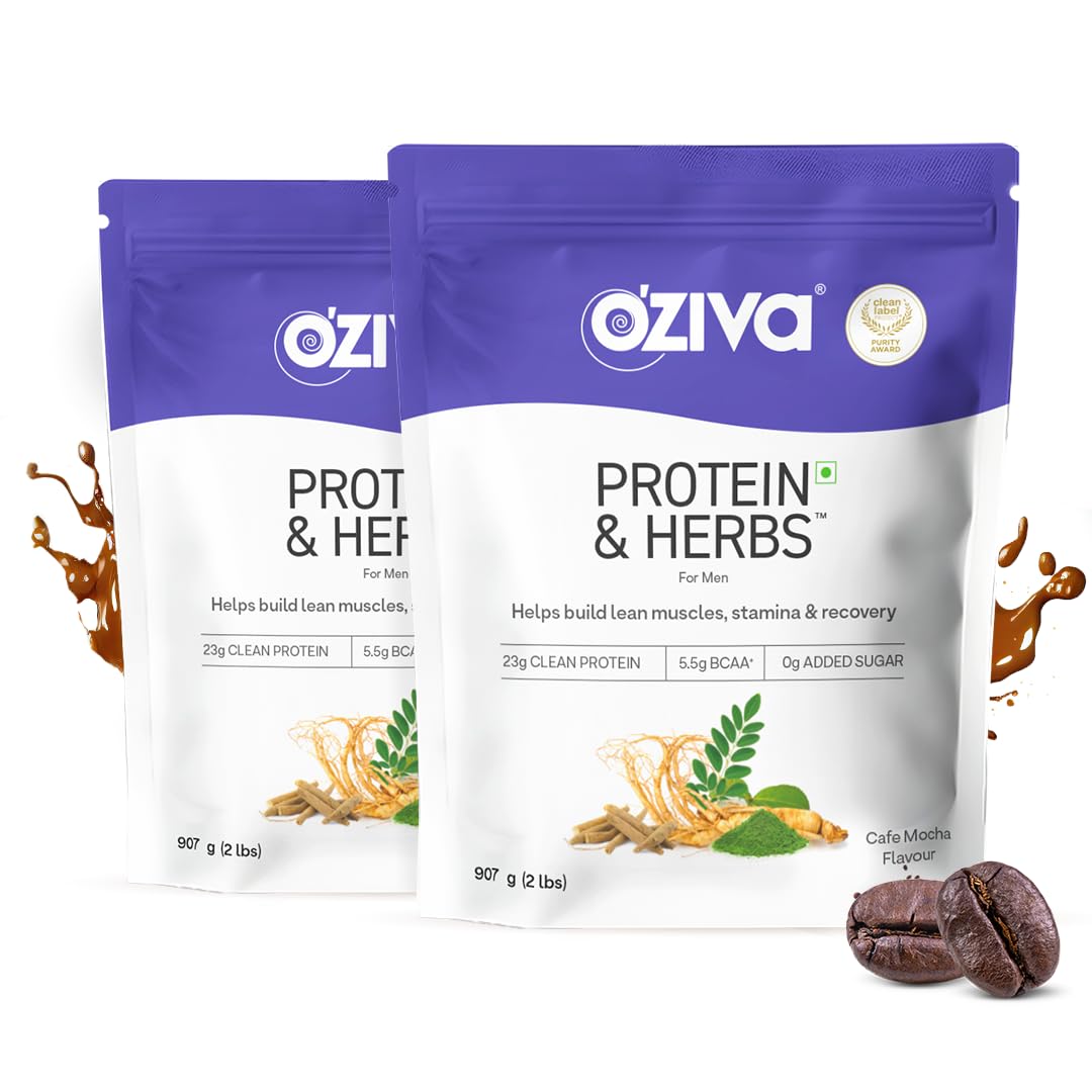OZiva Protein & Herbs Men (23g Whey Protein 5.5g BCAA & Ayurvedic herbs like Ashwagandha Chlorella & Musli) for Better Stamina & Lean Muscles (Cafe Mocha 4lbs Pack of 2)