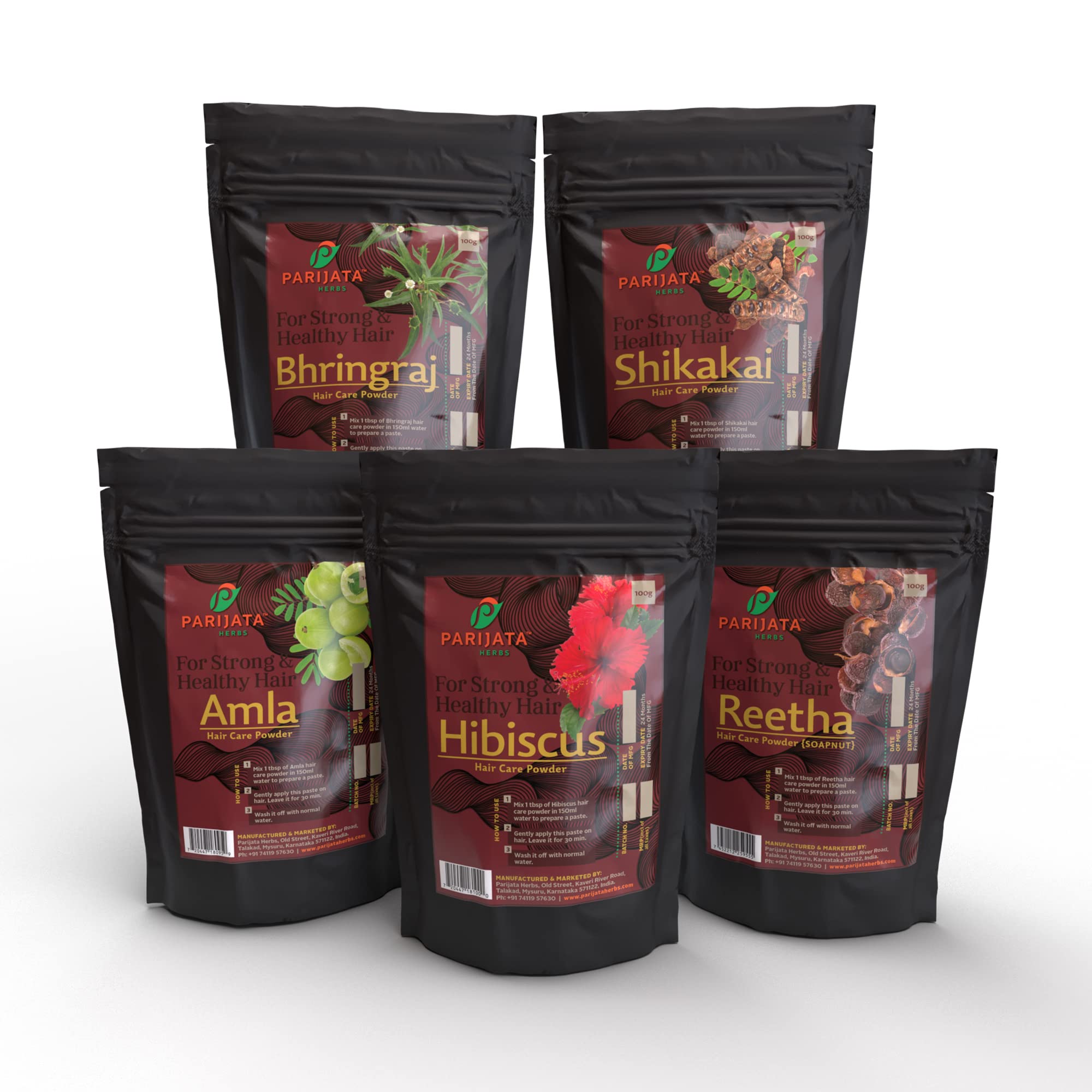 Parijata Herbs Combo Pack Natural Bhringa shikakai amla hibiscusreeta Powder Amla helps stimulate hair growth. It replenishes hair and induces hair growth Soapnuts also known as reetha soapberries or washing nuts have been used to make natural hair care products since time immemorial. Shikakai can make your hair soft and shinyShikakai is a gentle detangler Hibiscus powder is commonly combined with henna for a natural hair dye process and it is an important ingredient in many DIY beauty products like soaps skincare and natural blush.