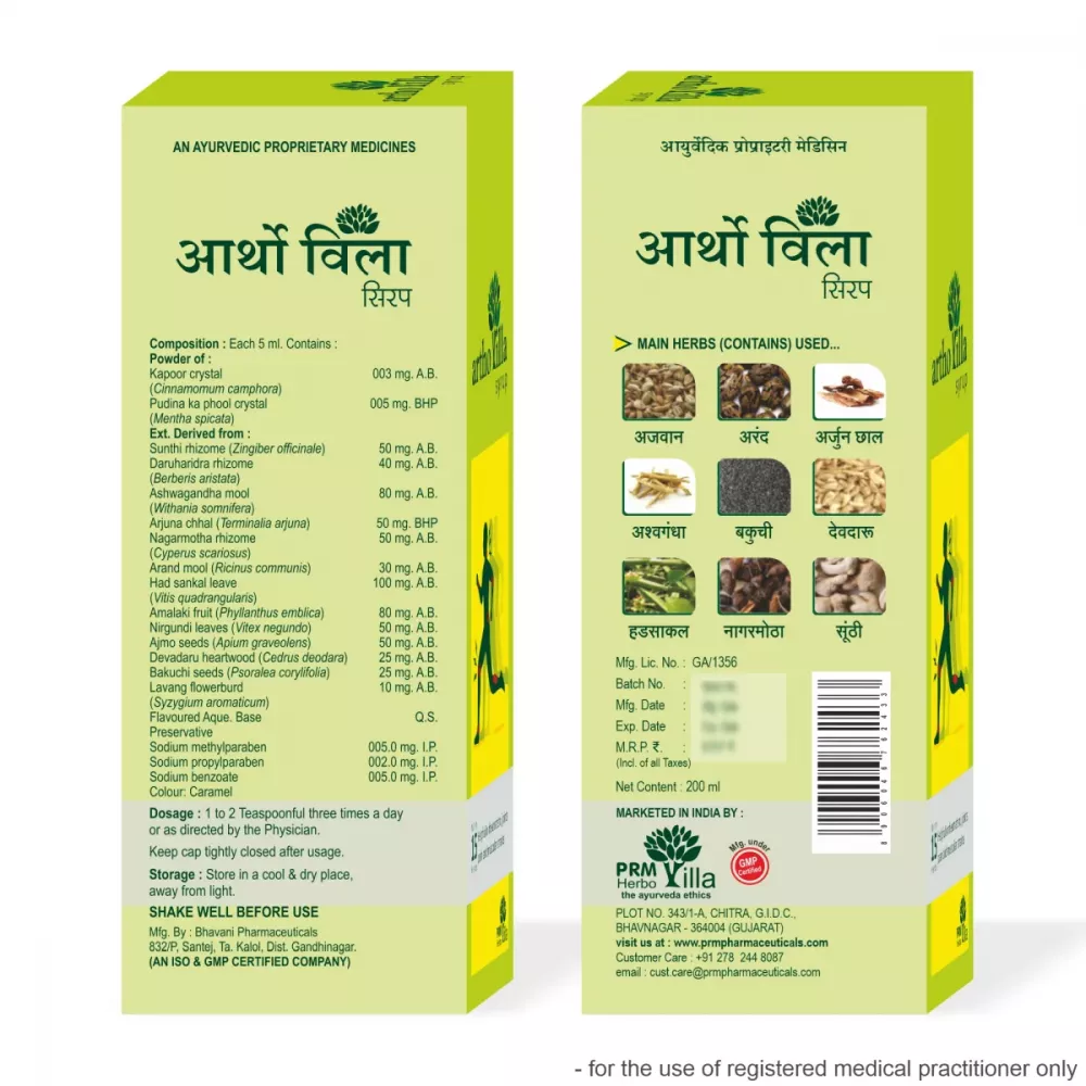 Arthovilla Syrup is the summation of selected 15 multi-combined ayurveda herbs like Sunthi, Hadsakal Leaves, Ajmo seeds, Daruharidra, Arjun Chhal, Ashwagandha, Amlaki and many more. Arthovilla Syrup is an ayurvedic proprietary medicine to restore joints and arthritis problem through balancing tri-doshas. This formula helps to relief from joints pain, muscle pain, sciatica, rheumatoid arthritis, frozen shoulder - sprain.