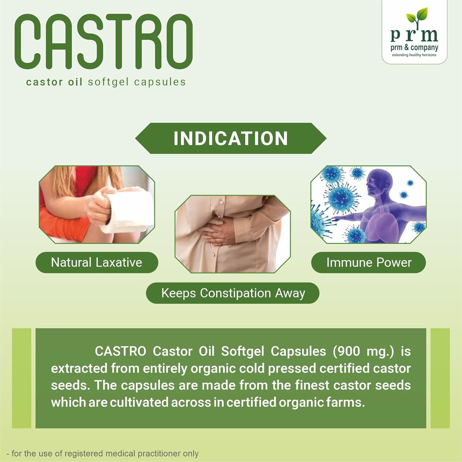CASTRO Castor Oil Softgel Capsules (900 mg.) are extracted from entirely organic cold pressed certified castor seeds. The capsules are made from the finest castor seeds which are cultivated across in certified organic farms.
