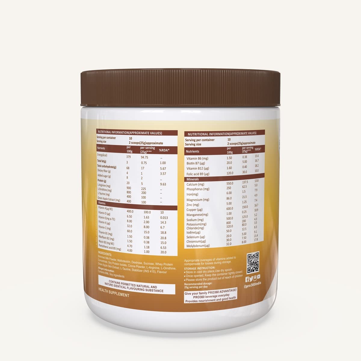 • Triple Protein Formula: Along with being rich in Fibre Vitamins and Minerals Pro360's Balanced Formula provides an amazing dose of High Protein as well. The Tri-Protein Formula consists of Skimmed Milk Powder Whey Protein and Soy Protein all of which comb