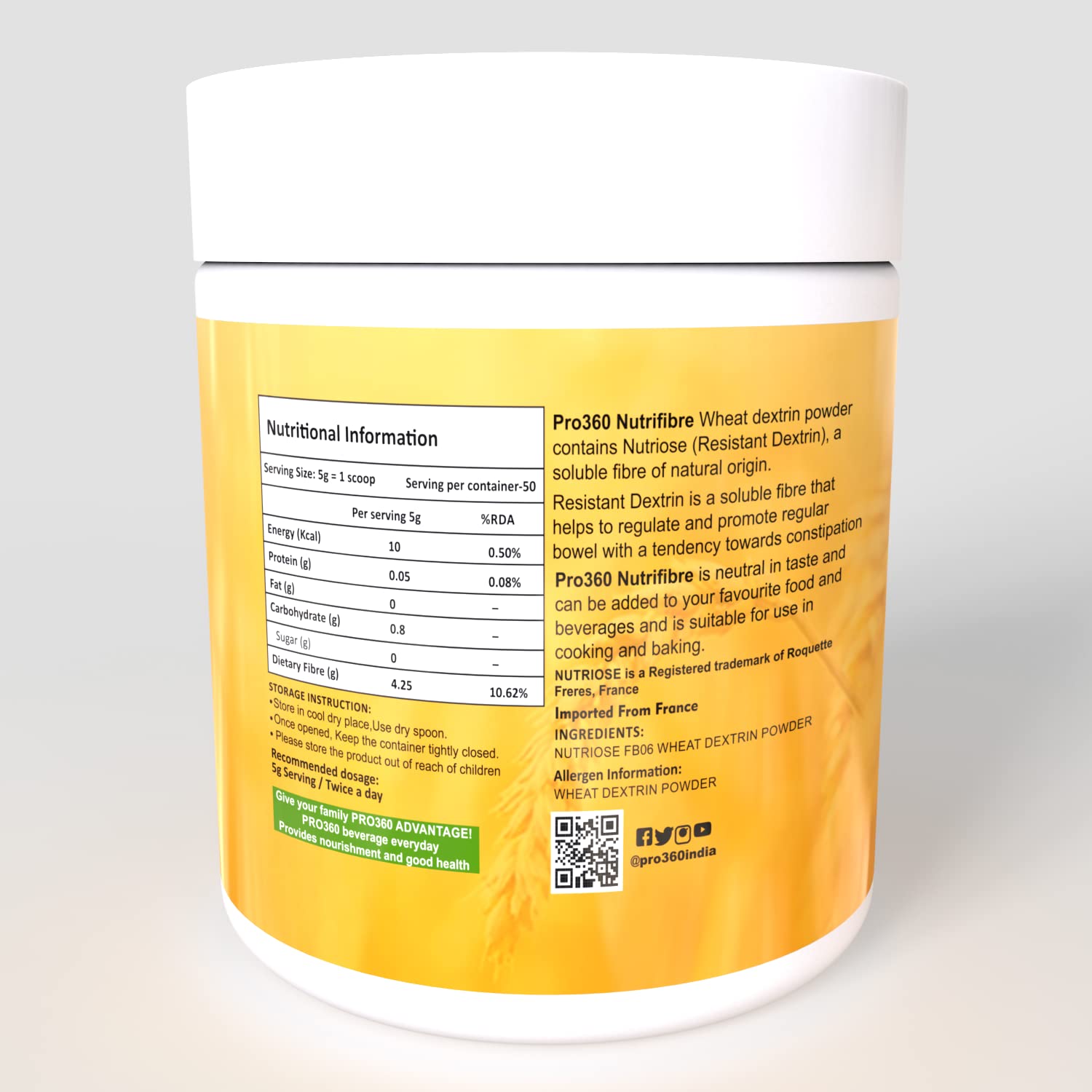 Pro360 NutriFibre is a thoughtfully crafted daily fiber supplement made with wheat dextrin to support your digestive wellness and help you feel light and refreshed throughout the day.